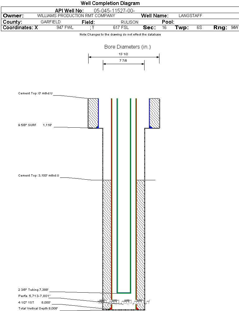 Wellbore #00 Wellbore Classification: GW Status: PR - 5/28/2006 Measured TD: 8023 ft. Vertical TD: 8008 ft.| Wellbore Data for Original Wellbore | Wellbore Classification: GW PR - 5/28/2006 | | Wellbore Permit | DIRECTIONAL | | Permit #: | 20054115 | Expiration Date: | 12/1/2006 | | Proposed Top PZ Location: | Sec: Twp: | Footage: 268 FSL 922 FWL | | Bottom Hole Location: | Sec: Twp: | Footage: 268 FSL 922 FWL | | Proposed Depth/Form: | 8051 ft. | | Surface Mineral Owner Same: | Yes | | Mineral Owner: | FEE | Surface Owner: | FEE | | Unit: | | Unit Number: | | | Formation And Spacing: | Code: WMFK , Formation: WILLIAMS FORK , Order: 139-38 , Unit Acreage: 320, Drill Unit: W2 |