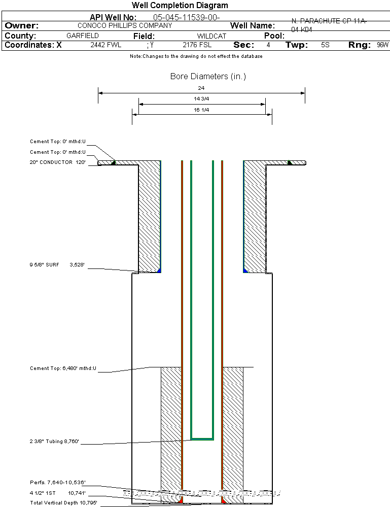 | Wellbore Completed | | Completion Date: | 2/7/2007 | | Spud Date: | 12/24/2006 | Spud Date Is: | ACTUAL | | Measured TD: | 10800 ft. | Measured PB depth: | | | True Vertical TD: | 10795 ft. | True Vertical PB depth: | | | Top PZ Location: | Sec:4 Twp: 5S 96W | Footage: 2176 FSL 2445 FWL | | Bottom Hole Location: | Sec:4 Twp: 5S 96W | Footage: 2176 FSL 2445 FWL | | Log Types: | CBL, VDL, GR-CCLTEMP, MULTIPOLE ACOUSTILOG, COMPENSATED NEUTRON, GR, CALIPER | | Casing: | String Type: CONDUCTOR, Hole Size: 24 in., Size: 20 in., Top: , Depth: 120 ft., Weight: , Citings Type: ACTUAL | | Cement: | Sacks: 6, Top: , Bottom: 120 ft., Determination Method: | | Casing: | String Type: SURF, Hole Size: 14.75 in., Size: 9.625 in., Top: , Depth: 3528 ft., Weight: , Citings Type: ACTUAL | | Cement: | Sacks: 2798, Top: , Bottom: 3528 ft., Determination Method: | | Casing: | String Type: 1ST, Hole Size: 8.75 in., Size: 4.5 in., Top: , Depth: 10741 ft., Weight: , Citings Type: ACTUAL | | Cement: | Sacks: 800, Top: 6480 ft., Bottom: 10740 ft., Determination Method: CBL | | Formation | Interval Top | Log Bottom | Cored | DSTs | | WASATCH | 3179 ft. | | N | N | | WASATCH G | 5319 ft. | | N | N | | OHIO CREEK | 6567 ft. | | N | N | | WILLIAMS FORK | 6975 ft. | | N | N | | CAMEO | 10058 ft. | | N | N | | ROLLINS | 10618 ft. | | N | N |