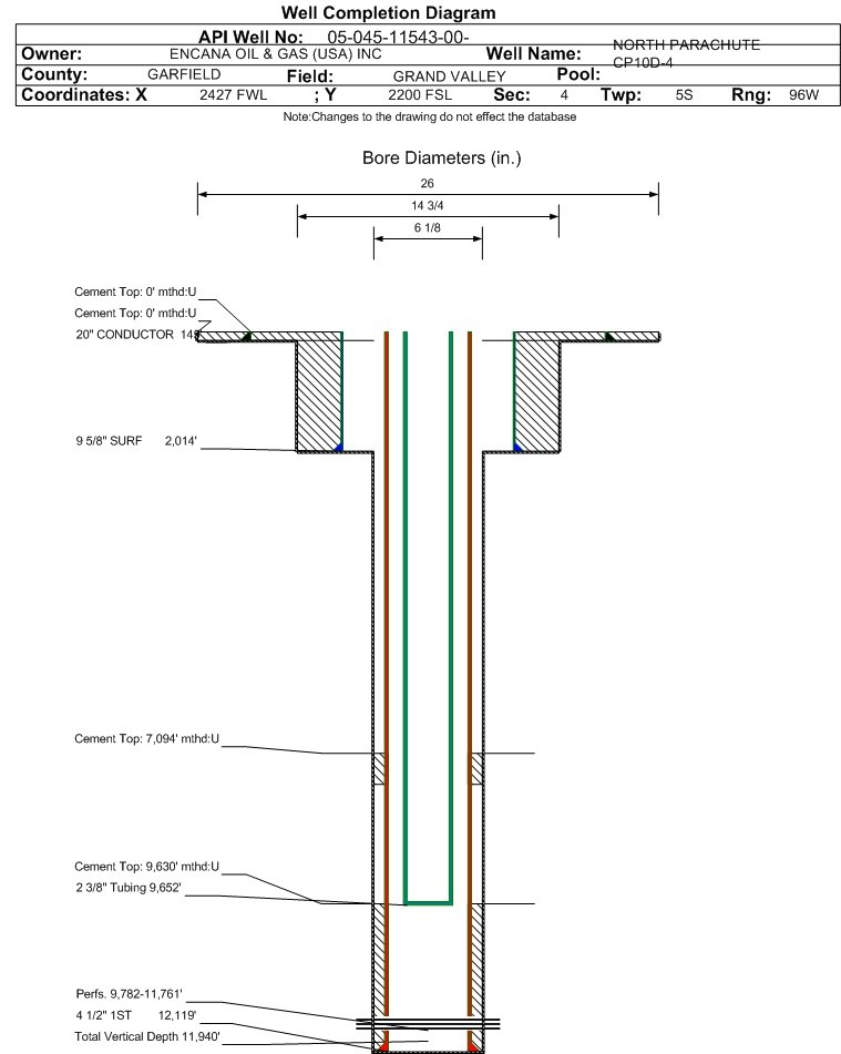 | Wellbore Completed | | Completion Date: | 6/20/2007 | | Spud Date: | 5/15/2007 | Spud Date Is: | ACTUAL | | Measured TD: | 12179 ft. | Measured PB depth: | 11940 ft. | | True Vertical TD: | 11940 ft. | True Vertical PB depth: | 11701 ft. | | Top PZ Location: | Sec:4 Twp: 5S 96W | Footage: 1596 FSL 1658 FEL | | Bottom Hole Location: | Sec:4 Twp: 5S 96W | Footage: 1596 FSL 1658 FEL | | Log Types: | CAL, GR, CEMENT EVAL, ARAY INDUCTION GR/SP,CBL, VDL, GR-CCL-TEMP, MICROLOG GR, SPEC GR | | Casing: | String Type: CONDUCTOR, Hole Size: 26 in., Size: 20 in., Top: , Depth: 145 ft., Weight: , Citings Type: ACTUAL | | Cement: | Sacks: 6, Top: , Bottom: 145 ft., Determination Method: | | Casing: | String Type: SURF, Hole Size: 14.75 in., Size: 9.625 in., Top: , Depth: 2014 ft., Weight: , Citings Type: ACTUAL | | Cement: | Sacks: 1407, Top: , Bottom: 2014 ft., Determination Method: | | Casing: | String Type: 1ST, Hole Size: 6.125 in., Size: 4.5 in., Top: , Depth: 12119 ft., Weight: , Citings Type: ACTUAL | | Cement: | Sacks: 225, Top: 9630 ft., Bottom: 12119 ft., Determination Method: CBL | | Casing: | String Type: S.C. 1.1, Hole Size: , Size: , Top: , Depth: 7620 ft., Weight: , Citings Type: ACTUAL | | Cement: | Sacks: 235, Top: 7094 ft., Bottom: 7620 ft., Determination Method: | | Formation | Interval Top | Log Bottom | Cored | DSTs | | WASATCH | 3162 ft. | | N | N | | WASATCH G | 5382 ft. | | N | N | | OHIO CREEK | 6679 ft. | | N | N | | WILLIAMS FORK | 7036 ft. | | N | N | | CAMEO | 10062 ft. | | N | N | | ROLLINS | 10629 ft. | | N | N |
