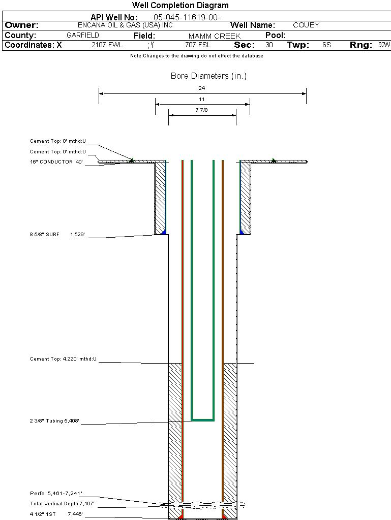 Wellbore #00 Wellbore Classification: GW Status: PR - 6/12/2006 Measured TD: 7448 ft. Vertical TD: 7167 ft.| Wellbore Data for Original Wellbore | Wellbore Classification: GW PR - 6/12/2006 | | Wellbore Permit | DIRECTIONAL | | Permit #: | 20054592 | Expiration Date: | 12/12/2006 | | Proposed Top PZ Location: | Sec:30 Twp: 6S 92W | Footage: 1370 FSL 750 FEL | | Bottom Hole Location: | Sec:30 Twp: 6S 92W | Footage: 1370 FSL 750 FEL | | Proposed Depth/Form: | 7448 ft. | | Surface Mineral Owner Same: | Yes | | Mineral Owner: | FEE | Surface Owner: | FEE | | Unit: | | Unit Number: | | | Formation And Spacing: | Code: ILES , Formation: ILES , Order: 191-10 , Unit Acreage: , Drill Unit: | | Formation And Spacing: | Code: WMFK , Formation: WILLIAMS FORK , Order: 191-8 , Unit Acreage: , Drill Unit: |