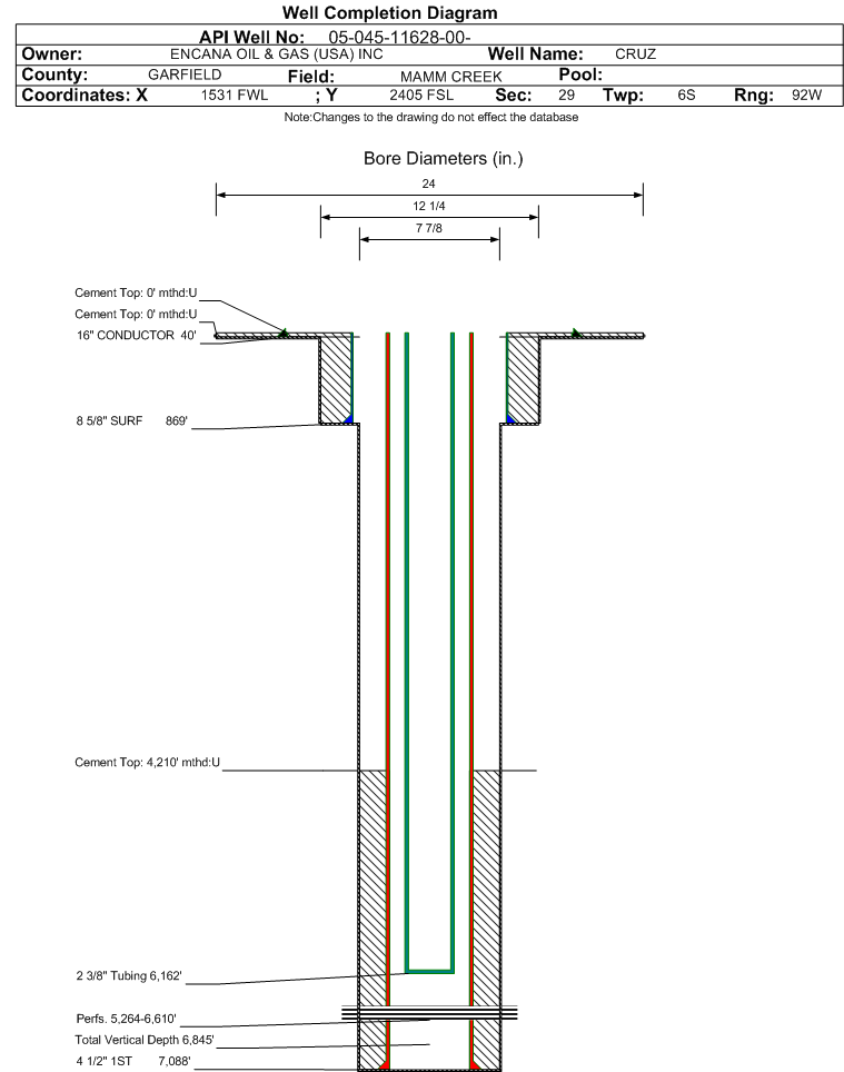 Wellbore #00 Wellbore Classification: GW Status: PR - 3/19/2007 Measured TD: 7088 ft. Vertical TD: 6845 ft.| Wellbore Data for Original Wellbore | Wellbore Classification: GW PR - 3/19/2007 | | Wellbore Permit | DIRECTIONAL | | Permit #: | 20066111 | Expiration Date: | 1/4/2008 | | Proposed Top PZ Location: | Sec:29 Twp: 6S 92W | Footage: 1372 FSL 707 FWL | | Bottom Hole Location: | Sec:29 Twp: 6S 92W | Footage: 1372 FSL 707 FWL | | Proposed Depth/Form: | 7447 ft. | | Surface Mineral Owner Same: | No | | Mineral Owner: | FEE | Surface Owner: | FEE | | Unit: | | Unit Number: | | | Formation And Spacing: | Code: ILES , Formation: ILES , Order: 191-10 , Unit Acreage: , Drill Unit: | | Formation And Spacing: | Code: WMFK , Formation: WILLIAMS FORK , Order: 191-8 , Unit Acreage: , Drill Unit: |