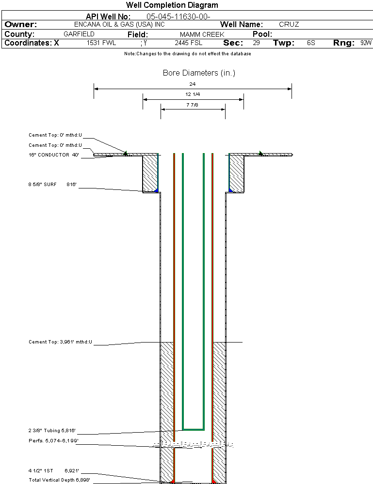 | Wellbore Completed | | Completion Date: | 1/3/2007 | | Spud Date: | 12/22/2006 | Spud Date Is: | ACTUAL | | Measured TD: | 6921 ft. | Measured PB depth: | 6501 ft. | | True Vertical TD: | 6898 ft. | True Vertical PB depth: | | | Top PZ Location: | Sec:29 Twp: 6S 92W | Footage: 2659 FSL 1844 FWL | | Bottom Hole Location: | Sec:29 Twp: 6S 92W | Footage: 2659 FSL 1844 FWL | | Log Types: | RST/GR/CCL/TEMP; PEX-AI/SP/GR (SURFACE HOLE ONLY); CMT EVAL (=CBL) | | Casing: | String Type: CONDUCTOR, Hole Size: 24 in., Size: 16 in., Top: 0 ft., Depth: 40 ft., Weight: 42 , Citings Type: ACTUAL | | Cement: | Sacks: , Top: 0 ft., Bottom: 40 ft., Determination Method: CALC | | Casing: | String Type: SURF, Hole Size: 12.25 in., Size: 8.625 in., Top: 0 ft., Depth: 816 ft., Weight: 32 , Citings Type: ACTUAL | | Cement: | Sacks: 475, Top: 0 ft., Bottom: 816 ft., Determination Method: CALC | | Casing: | String Type: 1ST, Hole Size: 7.875 in., Size: 4.5 in., Top: 0 ft., Depth: 6921 ft., Weight: 11.6 , Citings Type: ACTUAL | | Cement: | Sacks: 700, Top: 3961 ft., Bottom: 6921 ft., Determination Method: CBL | | Formation | Interval Top | Log Bottom | Cored | DSTs | | WASATCH | 0 ft. | 3857 ft. | N | N | | WILLIAMS FORK | 3858 ft. | | N | N |