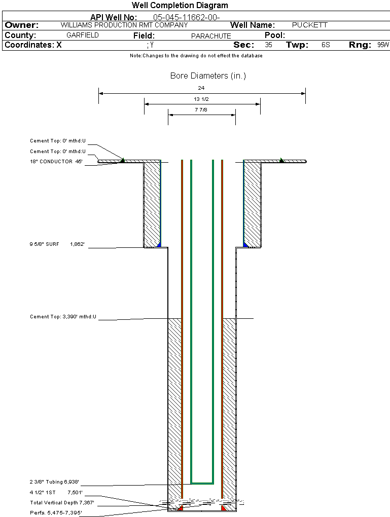 | Wellbore Completed | | Completion Date: | 3/19/2006 | | Spud Date: | 3/4/2006 | Spud Date Is: | ACTUAL | | Measured TD: | 7527 ft. | Measured PB depth: | 7469 ft. | | True Vertical TD: | 7367 ft. | True Vertical PB depth: | | | Top PZ Location: | Sec:35 Twp: 6S 95W | Footage: 2012 FNL 2397 FWL | | Bottom Hole Location: | Sec:35 Twp: 6S 95W | Footage: 2012 FNL 2397 FWL | | Log Types: | HIGH RESOLUTION INDUCTION,SPECTRAL DENSITY,DUAL SPACED NEUTRON | | Casing: | String Type: CONDUCTOR, Hole Size: 24 in., Size: 18 in., Top: 0 ft., Depth: 45 ft., Weight: , Citings Type: ACTUAL | | Cement: | Sacks: 25, Top: 0 ft., Bottom: 45 ft., Determination Method: | | Casing: | String Type: SURF, Hole Size: 13.5 in., Size: 9.625 in., Top: 0 ft., Depth: 1862 ft., Weight: , Citings Type: ACTUAL | | Cement: | Sacks: 495, Top: 0 ft., Bottom: 1862 ft., Determination Method: | | Casing: | String Type: 1ST, Hole Size: 7.875 in., Size: 4.5 in., Top: 0 ft., Depth: 7501 ft., Weight: , Citings Type: ACTUAL | | Cement: | Sacks: 882, Top: 3390 ft., Bottom: 7501 ft., Determination Method: CBL | | Formation | Interval Top | Log Bottom | Cored | DSTs | | WASATCH G | 1632 ft. | | N | N | | FORT UNION | 1953 ft. | | N | N | | MESAVERDE | 3932 ft. | | N | N | | CAMEO | 6732 ft. | | N | N | | ROLLINS | 7441 ft. | | N | N |