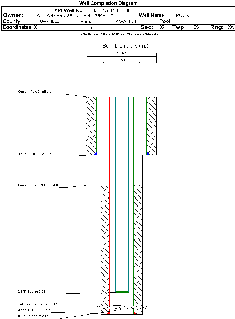 | Wellbore Completed | | Completion Date: | 2/12/2006 | | Spud Date: | 1/25/2006 | Spud Date Is: | ACTUAL | | Measured TD: | 7685 ft. | Measured PB depth: | 7600 ft. | | True Vertical TD: | 7360 ft. | True Vertical PB depth: | | | Top PZ Location: | Sec:35 Twp: 6S 95W | Footage: 2572 FNL 2635 FEL | | Bottom Hole Location: | Sec:35 Twp: 6S 95W | Footage: 2572 FNL 2635 FEL | | Log Types: | CBL; RESERVOIR MONITOR TOOL ELITE | | Casing: | String Type: SURF, Hole Size: 13.5 in., Size: 9.625 in., Top: 0 ft., Depth: 2039 ft., Weight: , Citings Type: ACTUAL | | Cement: | Sacks: 550, Top: 0 ft., Bottom: 2039 ft., Determination Method: CALC | | Casing: | String Type: 1ST, Hole Size: 7.875 in., Size: 4.5 in., Top: 0 ft., Depth: 7675 ft., Weight: , Citings Type: ACTUAL | | Cement: | Sacks: 1010, Top: 3100 ft., Bottom: 7675 ft., Determination Method: CBL | | Formation | Interval Top | Log Bottom | Cored | DSTs | | WASATCH G | 1800 ft. | | N | N | | FORT UNION | 2095 ft. | | N | N | | MESAVERDE | 4196 ft. | | N | N | | CAMEO | 7001 ft. | | N | N | | ROLLINS | 7687 ft. | | N | N |