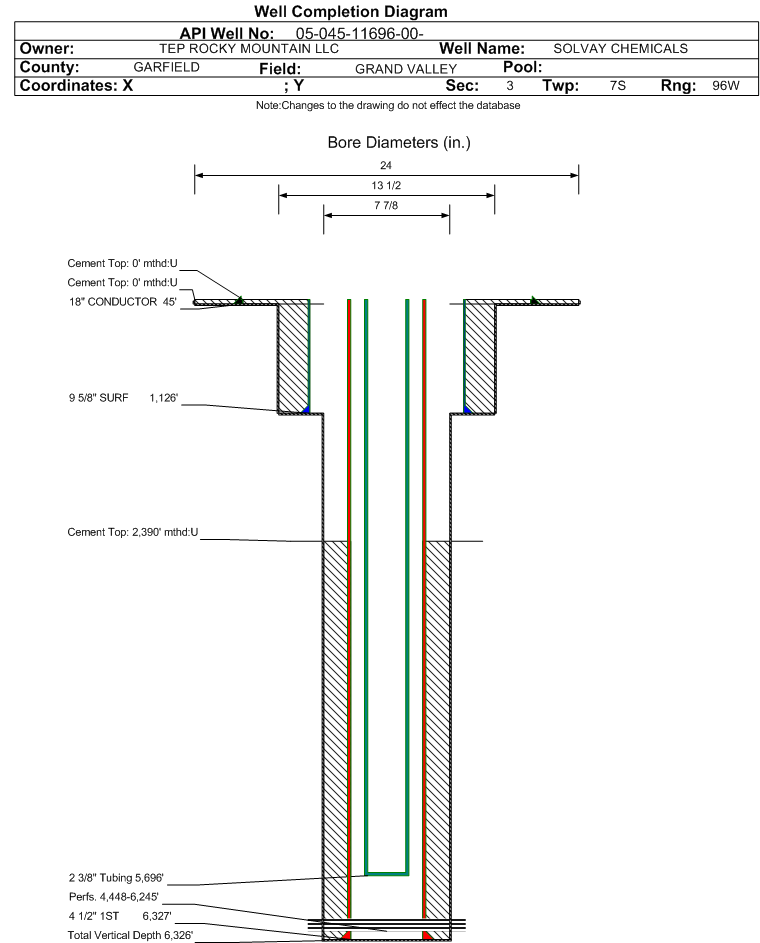 | Wellbore Completed | | Completion Date: | 1/13/2006 | | Spud Date: | 1/6/2006 | Spud Date Is: | ACTUAL | | Measured TD: | 6350 ft. | Measured PB depth: | 6301 ft. | | True Vertical TD: | 6326 ft. | True Vertical PB depth: | | | Top PZ Location: | Sec:3 Twp: 7S 96W | Footage: 417 FNL 714 FEL | | Bottom Hole Location: | Sec:3 Twp: 7S 96W | Footage: 417 FNL 714 FEL | | Log Types: | CBL; RESERVOIR MONITOR TOOL ELITE | | Casing: | String Type: CONDUCTOR, Hole Size: 24 in., Size: 18 in., Top: 0 ft., Depth: 45 ft., Weight: , Citings Type: ACTUAL | | Cement: | Sacks: 25, Top: 0 ft., Bottom: 45 ft., Determination Method: CALC | | Casing: | String Type: SURF, Hole Size: 13.5 in., Size: 9.625 in., Top: 0 ft., Depth: 1126 ft., Weight: , Citings Type: ACTUAL | | Cement: | Sacks: 375, Top: 0 ft., Bottom: 1126 ft., Determination Method: CALC | | Casing: | String Type: 1ST, Hole Size: 7.875 in., Size: 4.5 in., Top: 0 ft., Depth: 6327 ft., Weight: , Citings Type: ACTUAL | | Cement: | Sacks: 818, Top: 2390 ft., Bottom: 6326 ft., Determination Method: CBL | | Formation | Interval Top | Log Bottom | Cored | DSTs | | WASATCH G | 1513 ft. | | N | N | | FORT UNION | 1830 ft. | | N | N | | MESAVERDE | 3257 ft. | | N | N | | CAMEO | 5779 ft. | | N | N | | ROLLINS | 6279 ft. | | N | N |