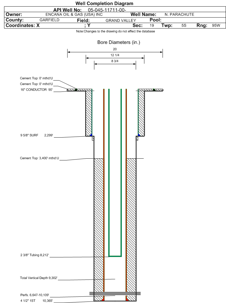 Wellbore #00 Wellbore Classification: GW Status: PR - 3/31/2008 Measured TD: 10385 ft. Vertical TD: 9302 ft.| Wellbore Data for Original Wellbore | Wellbore Classification: GW PR - 3/31/2008 | | Wellbore Permit | DIRECTIONAL | | Permit #: | 20054379 | Expiration Date: | 12/27/2006 | | Proposed Top PZ Location: | Sec:24 Twp: 5S 96W | Footage: 640 FNL 1063 FEL | | Bottom Hole Location: | Sec:24 Twp: 5S 96W | Footage: 800 FNL 2024 FEL | | Proposed Depth/Form: | 10957 ft. | | Surface Mineral Owner Same: | Yes | | Mineral Owner: | FEE | Surface Owner: | FEE | | Unit: | | Unit Number: | | | Formation And Spacing: | Code: WMFK , Formation: WILLIAMS FORK , Order: 479-15,510, Unit Acreage: , Drill Unit: | | Casing: | String Type: 1ST, Hole Size: 8.75 in., Size: 4.5 in., Top: , Depth: 10957 ft., Weight: 11.6 , Citings Type: PLANNED | | Cement: | Sacks: 805, Top: 200 ft., Bottom: 10957 ft. |