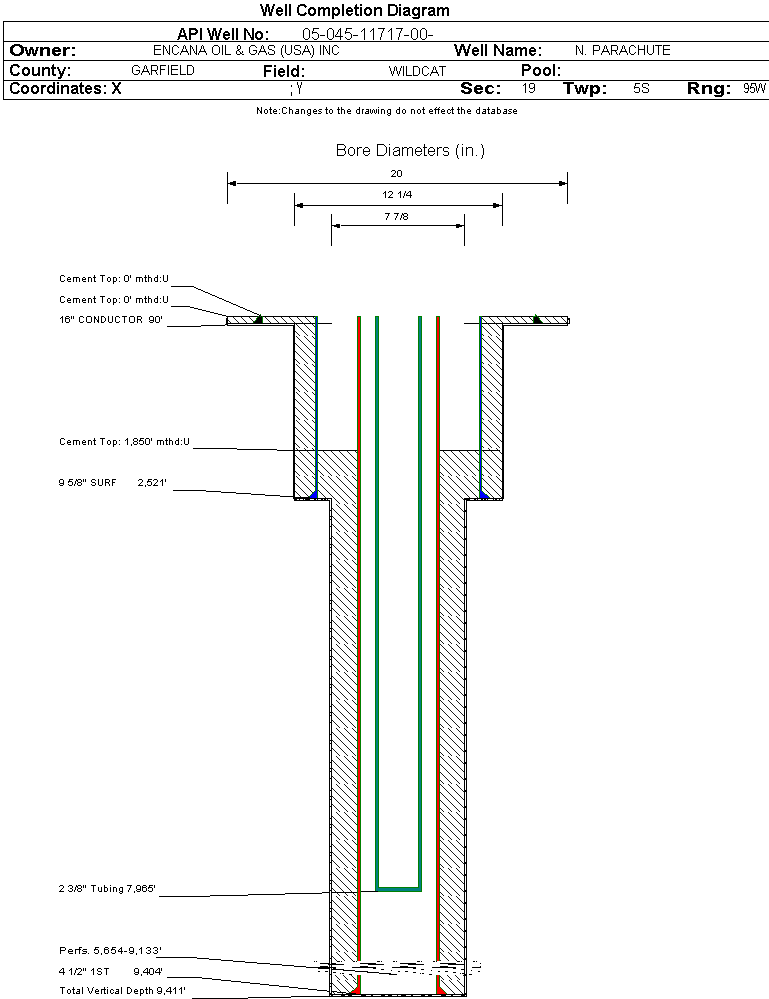| Wellbore Completed | | Completion Date: | 7/1/2006 | | Spud Date: | 6/17/2006 | Spud Date Is: | ACTUAL | | Measured TD: | 9420 ft. | Measured PB depth: | 9359 ft. | | True Vertical TD: | 9411 ft. | True Vertical PB depth: | | | Top PZ Location: | Sec:19 Twp: 5S 95W | Footage: 1541 FNL 1088 FWL | | Bottom Hole Location: | Sec:19 Twp: 5S 95W | Footage: 1541 FNL 1088 FWL | | Log Types: | CBL/GR/CCL; MUDLOG | | Casing: | String Type: CONDUCTOR, Hole Size: 20 in., Size: 16 in., Top: , Depth: 90 ft., Weight: , Citings Type: ACTUAL | | Cement: | Sacks: , Top: 0 ft., Bottom: 90 ft., Determination Method: CALC | | Casing: | String Type: SURF, Hole Size: 12.25 in., Size: 9.625 in., Top: 0 ft., Depth: 2521 ft., Weight: 36 , Citings Type: ACTUAL | | Cement: | Sacks: 700, Top: 0 ft., Bottom: 2535 ft., Determination Method: CALC | | Casing: | String Type: 1ST, Hole Size: 7.875 in., Size: 4.5 in., Top: 0 ft., Depth: 9404 ft., Weight: 11.6 , Citings Type: ACTUAL | | Cement: | Sacks: 1365, Top: 1850 ft., Bottom: 9420 ft., Determination Method: CBL | | Formation | Interval Top | Log Bottom | Cored | DSTs | | WILLIAMS FORK | 5525 ft. | 9256 ft. | N | N | | ROLLINS | 9256 ft. | 9420 ft. | N | N |