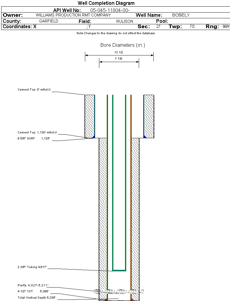| Wellbore Completed | | Completion Date: | 3/20/2006 | | Spud Date: | 3/14/2006 | Spud Date Is: | ACTUAL | | Measured TD: | 5425 ft. | Measured PB depth: | 5366 ft. | | True Vertical TD: | 5335 ft. | True Vertical PB depth: | | | Top PZ Location: | Sec:27 Twp: 7S 96W | Footage: 802 FNL 437 FEL | | Bottom Hole Location: | Sec:27 Twp: 7S 96W | Footage: 802 FNL 437 FEL | | Log Types: | CBL; HIGH RESOLUTION INDUCTION, SPECTRAL DENSITY, DUAL SPACED NEUTRON | | Casing: | String Type: SURF, Hole Size: 13.5 in., Size: 9.625 in., Top: 0 ft., Depth: 1125 ft., Weight: , Citings Type: ACTUAL | | Cement: | Sacks: 375, Top: 0 ft., Bottom: 1125 ft., Determination Method: CALC | | Casing: | String Type: 1ST, Hole Size: 7.875 in., Size: 4.5 in., Top: 0 ft., Depth: 5386 ft., Weight: , Citings Type: ACTUAL | | Cement: | Sacks: 850, Top: 1130 ft., Bottom: 5386 ft., Determination Method: CBL | | Formation | Interval Top | Log Bottom | Cored | DSTs | | WASATCH G | 689 ft. | | N | N | | FORT UNION | 1093 ft. | | N | N | | MESAVERDE | 2427 ft. | | N | N | | CAMEO | 4770 ft. | | N | N | | ROLLINS | 5249 ft. | | N | N |
