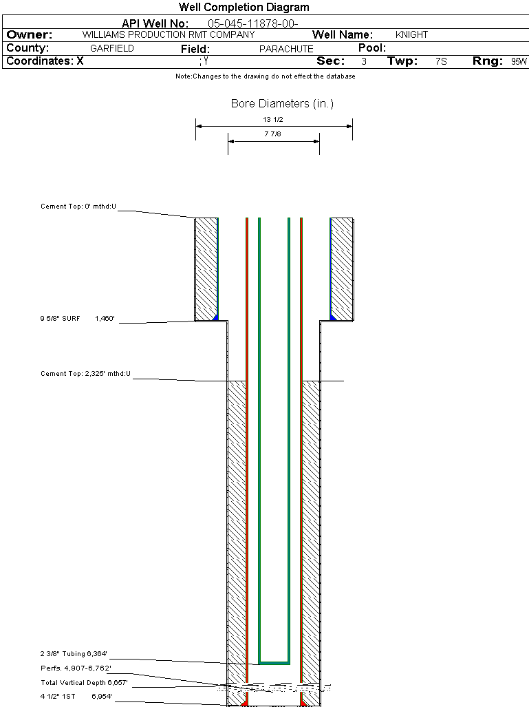 Wellbore #00 Wellbore Classification: GW Status: PR - 2/14/2013 Measured TD: 6964 ft. Vertical TD: 6657 ft.| Wellbore Data for Original Wellbore | Wellbore Classification: GW PR - 2/14/2013 | | Wellbore Permit | DIRECTIONAL | | Permit #: | 20055056 | Expiration Date: | 1/30/2007 | | Proposed Top PZ Location: | Sec: Twp: | Footage: 2341 FNL 519 FWL | | Bottom Hole Location: | Sec:3 Twp: 7S 96W | Footage: 2341 FNL 519 FWL | | Proposed Depth/Form: | 6969 ft. | | Surface Mineral Owner Same: | Yes | | Mineral Owner: | FEE | Surface Owner: | FEE | | Unit: | | Unit Number: | | | Formation And Spacing: | Code: WMFK , Formation: WILLIAMS FORK , Order: 510-12 , Unit Acreage: 640, Drill Unit: SEC. |