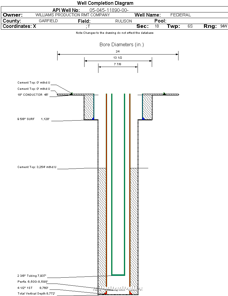 | Wellbore Completed | | Completion Date: | 8/22/2007 | | Spud Date: | 8/5/2007 | Spud Date Is: | ACTUAL | | Measured TD: | 8780 ft. | Measured PB depth: | 8739 ft. | | True Vertical TD: | 8772 ft. | True Vertical PB depth: | | | Top PZ Location: | Sec:18 Twp: 6S 94W | Footage: 2203 FNL 1723 FWL | | Bottom Hole Location: | Sec:18 Twp: 6S 94W | Footage: 2203 FNL 1723 FWL | | Log Types: | CBL; RMTE, MUD | | Casing: | String Type: CONDUCTOR, Hole Size: 24 in., Size: 18 in., Top: , Depth: 45 ft., Weight: 48 , Citings Type: ACTUAL | | Cement: | Sacks: 25, Top: , Bottom: 45 ft., Determination Method: CALC | | Casing: | String Type: SURF, Hole Size: 13.5 in., Size: 9.625 in., Top: , Depth: 1128 ft., Weight: , Citings Type: ACTUAL | | Cement: | Sacks: 375, Top: , Bottom: 1127 ft., Determination Method: CALC | | Casing: | String Type: 1ST, Hole Size: 7.875 in., Size: 4.5 in., Top: , Depth: 8760 ft., Weight: , Citings Type: ACTUAL | | Cement: | Sacks: 1070, Top: 3254 ft., Bottom: 8760 ft., Determination Method: CBL | | Formation | Interval Top | Log Bottom | Cored | DSTs | | GREELEY SAND | 2713 ft. | | N | N | | WILLIAMS FORK | 5089 ft. | | N | N | | CAMEO | 7705 ft. | | N | N | | ROLLINS | 8703 ft. | | N | N |