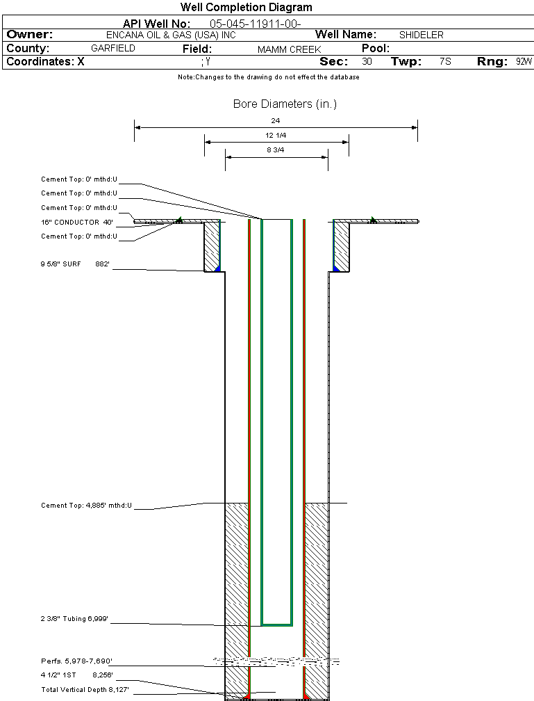 | Wellbore Completed | | Completion Date: | 12/20/2007 | | Spud Date: | 12/7/2007 | Spud Date Is: | ACTUAL | | Measured TD: | 8267 ft. | Measured PB depth: | 7994 ft. | | True Vertical TD: | 8127 ft. | True Vertical PB depth: | 7854 ft. | | Top PZ Location: | Sec:25 Twp: 7S 93W | Footage: 2210 FSL 657 FEL | | Bottom Hole Location: | Sec:25 Twp: 7S 93W | Footage: 2210 FSL 657 FEL | | Log Types: | TRIPLE COMBO, CBL W/TEMP | | Casing: | String Type: CONDUCTOR, Hole Size: 24 in., Size: 16 in., Top: 0 ft., Depth: 40 ft., Weight: , Citings Type: ACTUAL | | Cement: | Sacks: 4, Top: 0 ft., Bottom: 40 ft., Determination Method: CALC | | Casing: | String Type: SURF, Hole Size: 12.25 in., Size: 9.625 in., Top: 0 ft., Depth: 882 ft., Weight: , Citings Type: ACTUAL | | Cement: | Sacks: 460, Top: 0 ft., Bottom: 890 ft., Determination Method: CALC | | Casing: | String Type: 1ST, Hole Size: 8.75 in., Size: 4.5 in., Top: 0 ft., Depth: 8256 ft., Weight: , Citings Type: ACTUAL | | Cement: | Sacks: 900, Top: 4885 ft., Bottom: 8267 ft., Determination Method: CBL | | Casing: | String Type: 2ND, Hole Size: , Size: , Top: 0 ft., Depth: , Weight: , Citings Type: ACTUAL | | Cement: | Sacks: , Top: , Bottom: , Determination Method: | | Casing: | String Type: 3RD, Hole Size: , Size: , Top: 0 ft., Depth: , Weight: , Citings Type: ACTUAL | | Cement: | Sacks: , Top: , Bottom: , Determination Method: | | Casing: | String Type: 1ST LINER, Hole Size: , Size: , Top: 0 ft., Depth: , Weight: , Citings Type: ACTUAL | | Cement: | Sacks: , Top: , Bottom: , Determination Method: | | Formation | Interval Top | Log Bottom | Cored | DSTs | | WASATCH | 0 ft. | 5079 ft. | N | N | | WILLIAMS FORK | 5080 ft. | 8267 ft. | N | N |