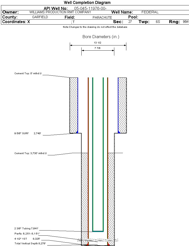 Wellbore #00 Wellbore Classification: GW Status: PR - 1/8/2007 Measured TD: 8338 ft. Vertical TD: 8278 ft.| Wellbore Data for Original Wellbore | Wellbore Classification: GW PR - 1/8/2007 | | Wellbore Permit | DIRECTIONAL | | Permit #: | 20070078 | Expiration Date: | 1/22/2008 | | Proposed Top PZ Location: | Sec: Twp: | Footage: 2386 FNL 2070 FWL | | Bottom Hole Location: | Sec:27 Twp: 6S 95W | Footage: 2386 FNL 2070 FWL | | Proposed Depth/Form: | 8398 ft. | | Surface Mineral Owner Same: | Yes | | Mineral Owner: | FEDERAL | Surface Owner: | FEDERAL | | Unit: | | Unit Number: | | | Formation And Spacing: | Code: WMFK , Formation: WILLIAMS FORK , Order: 440-25 , Unit Acreage: 320, Drill Unit: N/2 | | Casing: | String Type: CONDUCTOR, Hole Size: 13.5 in., Size: 9.625 in., Top: , Depth: 2663 ft., Weight: 36 , Citings Type: PLANNED | | Cement: | Sacks: 1107, Top: 0 ft., Bottom: 2663 ft. |