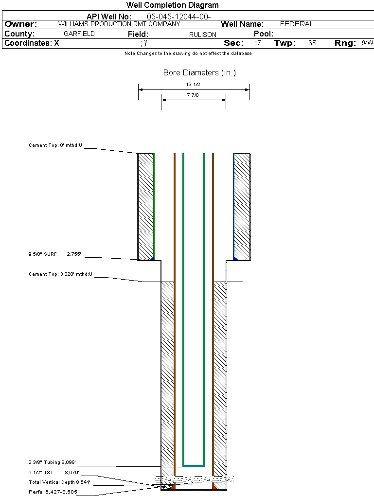 Wellbore #00 Wellbore Classification: GW Status: PR - 2/2/2006 Measured TD: 8700 ft. Vertical TD: 8541 ft.| Wellbore Data for Original Wellbore | Wellbore Classification: GW PR - 2/2/2006 | | Wellbore Permit | DIRECTIONAL | | Permit #: | 20060511 | Expiration Date: | 3/22/2007 | | Proposed Top PZ Location: | Sec: Twp: | Footage: 2689 FNL 627 FWL | | Bottom Hole Location: | Sec:17 Twp: 6S 94W | Footage: 2689 FNL 627 FWL | | Proposed Depth/Form: | 8778 ft. | | Surface Mineral Owner Same: | Yes | | Mineral Owner: | FEDERAL | Surface Owner: | FEDERAL | | Unit: | | Unit Number: | | | Formation And Spacing: | Code: WMFK , Formation: WILLIAMS FORK , Order: 139-40 , Unit Acreage: 320, Drill Unit: W/2 |