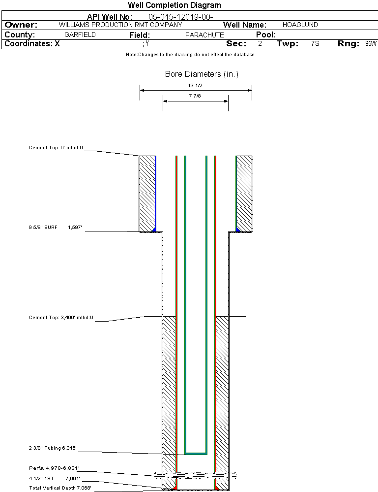 Wellbore #00 Wellbore Classification: GW Status: PR - 1/31/2006 Measured TD: 7101 ft. Vertical TD: 7068 ft.| Wellbore Data for Original Wellbore | Wellbore Classification: GW PR - 1/31/2006 | | Wellbore Permit | DIRECTIONAL | | Permit #: | 20060475 | Expiration Date: | 3/22/2007 | | Proposed Top PZ Location: | Sec: Twp: | Footage: 453 FNL 583 FWL | | Bottom Hole Location: | Sec:2 Twp: 7S 95W | Footage: 453 FNL 583 FWL | | Proposed Depth/Form: | 7084 ft. | | Surface Mineral Owner Same: | No | | Mineral Owner: | FEE | Surface Owner: | FEE | | Unit: | | Unit Number: | | | Formation And Spacing: | Code: WMFK , Formation: WILLIAMS FORK , Order: 440-28 , Unit Acreage: 320, Drill Unit: W2 |