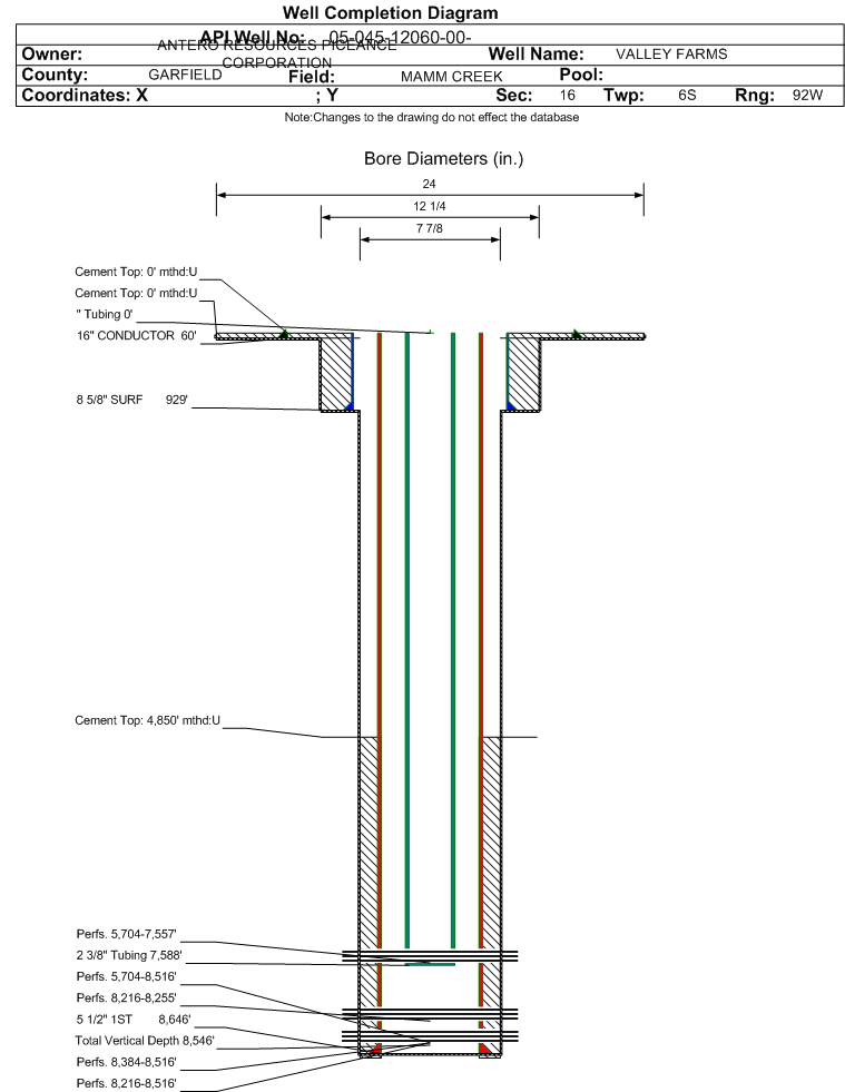 | Wellbore Completed | | Completion Date: | 10/30/2006 | | Spud Date: | 8/2/2006 | Spud Date Is: | ACTUAL | | Measured TD: | 8701 ft. | Measured PB depth: | 8651 ft. | | True Vertical TD: | 8546 ft. | True Vertical PB depth: | 8496 ft. | | Top PZ Location: | Sec:16 Twp: 6S 92W | Footage: 958 FNL 423 FEL | | Bottom Hole Location: | Sec:16 Twp: 6S 92W | Footage: 949 FNL 450 FEL | | Log Types: | CHI-T COMBO (NEUTRON/DENSITY/INDUCTION); CBL | | Casing: | String Type: CONDUCTOR, Hole Size: 24 in., Size: 16 in., Top: 0 ft., Depth: 60 ft., Weight: , Citings Type: ACTUAL | | Cement: | Sacks: 110, Top: 0 ft., Bottom: 60 ft., Determination Method: CALC | | Casing: | String Type: SURF, Hole Size: 12.25 in., Size: 8.625 in., Top: 0 ft., Depth: 929 ft., Weight: 24 , Citings Type: ACTUAL | | Cement: | Sacks: 501, Top: 0 ft., Bottom: 935 ft., Determination Method: CALC | | Casing: | String Type: 1ST, Hole Size: 7.875 in., Size: 5.5 in., Top: 0 ft., Depth: 8646 ft., Weight: 17 , Citings Type: ACTUAL | | Cement: | Sacks: 1000, Top: 4850 ft., Bottom: 8701 ft., Determination Method: CBL | | Formation | Interval Top | Log Bottom | Cored | DSTs | | MESAVERDE | 3988 ft. | | N | N | | CAMEO | 6554 ft. | | N | N | | ROLLINS | 7598 ft. | | N | N | | COZZETTE | 8146 ft. | | N | N | | CORCORAN | 8352 ft. | | N | N |
