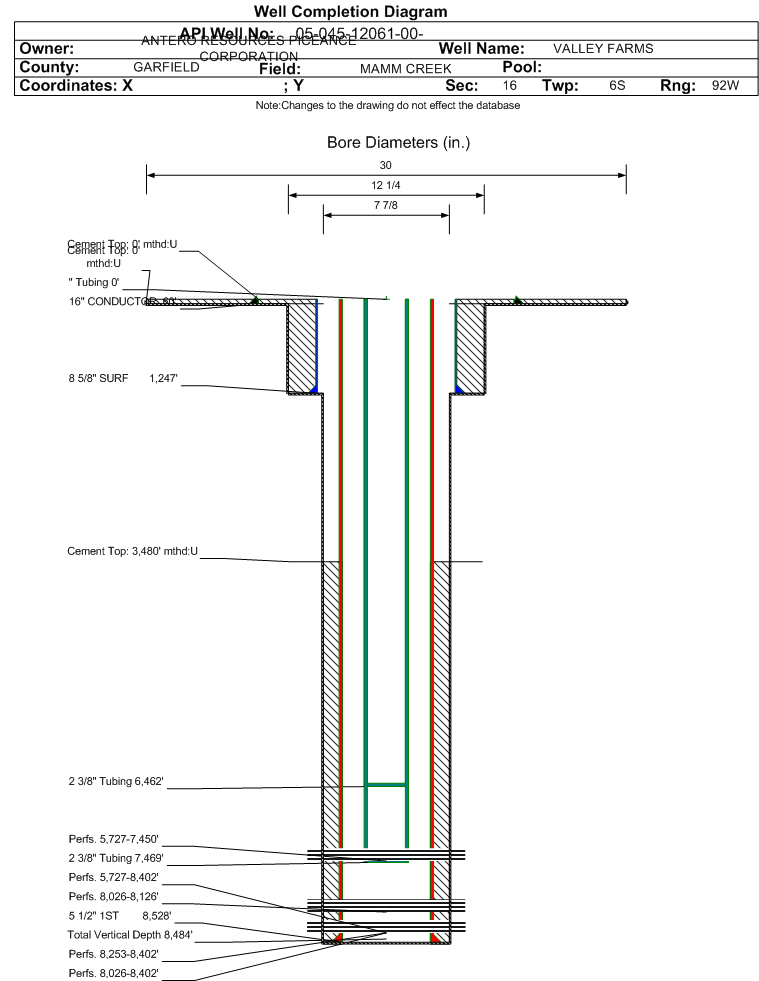 Wellbore #00 Wellbore Classification: GW Status: PR - 3/27/2010 Measured TD: 8550 ft. Vertical TD: 8484 ft.| Wellbore Data for Original Wellbore | Wellbore Classification: GW PR - 3/27/2010 | | Wellbore Permit | DIRECTIONAL | | Permit #: | 20070379 | Expiration Date: | 2/25/2008 | | Proposed Top PZ Location: | Sec: Twp: | Footage: 2344 FNL 550 FEL | | Bottom Hole Location: | Sec:16 Twp: 6S 92W | Footage: 2344 FNL 550 FEL | | Proposed Depth/Form: | 7558 ft. | | Surface Mineral Owner Same: | Yes | | Mineral Owner: | FEE | Surface Owner: | FEE | | Unit: | | Unit Number: | | | Formation And Spacing: | Code: ILES , Formation: ILES , Order: 191-25 , Unit Acreage: , Drill Unit: | | Formation And Spacing: | Code: WMFK , Formation: WILLIAMS FORK , Order: 191-17 , Unit Acreage: , Drill Unit: |