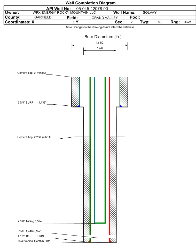 Wellbore #00 Wellbore Classification: GW Status: PR - 2/13/2007 Measured TD: 6330 ft. Vertical TD: 6304 ft.| Wellbore Data for Original Wellbore | Wellbore Classification: GW PR - 2/13/2007 | | Wellbore Permit | DIRECTIONAL | | Permit #: | 20060607 | Expiration Date: | 4/4/2007 | | Proposed Top PZ Location: | Sec: Twp: | Footage: 2074 FNL 1238 FWL | | Bottom Hole Location: | Sec:2 Twp: 7S 96W | Footage: 2074 FNL 1238 FWL | | Proposed Depth/Form: | 6368 ft. | | Surface Mineral Owner Same: | No | | Mineral Owner: | FEE | Surface Owner: | FEE | | Unit: | | Unit Number: | | | Formation And Spacing: | Code: WMFK , Formation: WILLIAMS FORK , Order: 139-38 , Unit Acreage: 160, Drill Unit: NW4 |