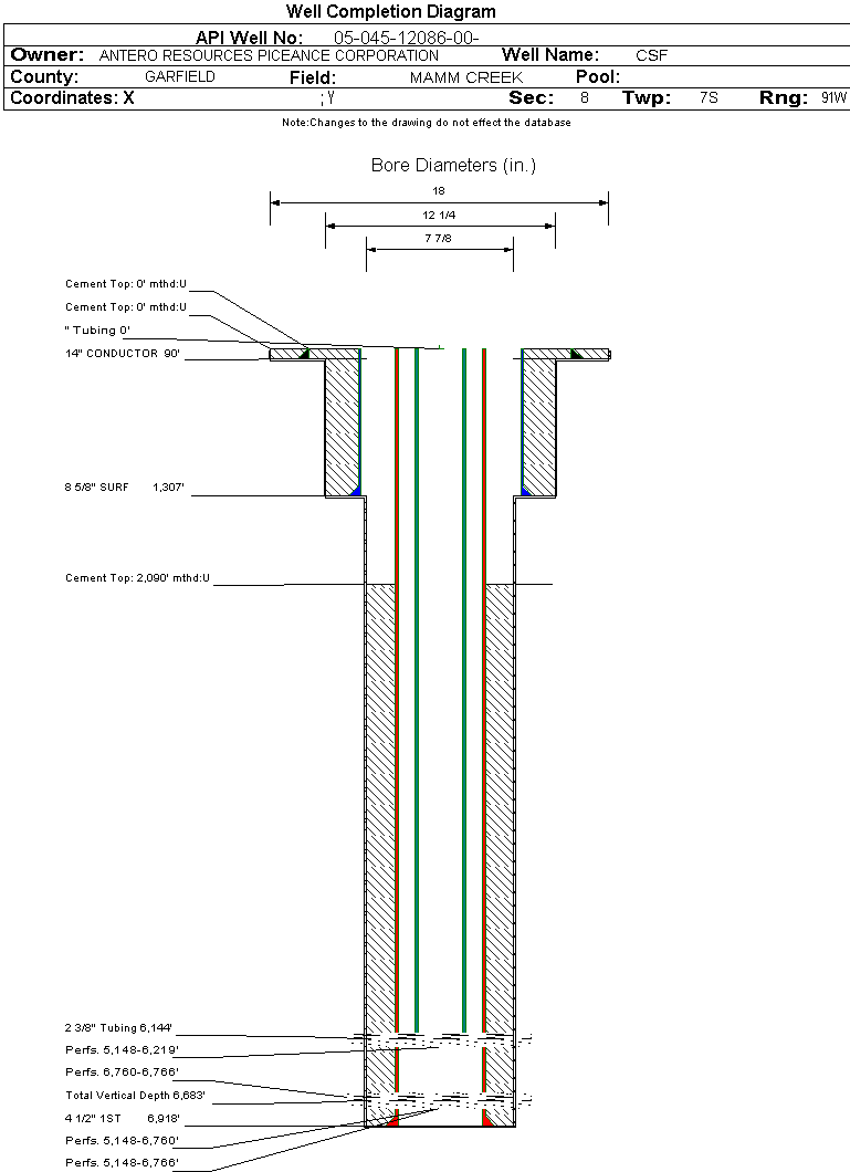 Wellbore #00 Wellbore Classification: GW Status: PR - 10/1/2017 Measured TD: 6933 ft. Vertical TD: 6683 ft.| Wellbore Data for Original Wellbore | Wellbore Classification: GW PR - 10/1/2017 | | Wellbore Permit | DIRECTIONAL | | Permit #: | | Expiration Date: | 4/5/2007 | | Proposed Top PZ Location: | Sec: Twp: | Footage: 1998 FNL 1992 FWL | | Bottom Hole Location: | Sec:8 Twp: 7S 91W | Footage: 1998 FNL 1992 FWL | | Proposed Depth/Form: | 7054 ft. | | Surface Mineral Owner Same: | Yes | | Mineral Owner: | FEDERAL | Surface Owner: | FEDERAL | | Unit: | | Unit Number: | | | Formation And Spacing: | Code: ILES , Formation: ILES , Order: , Unit Acreage: , Drill Unit: | | Formation And Spacing: | Code: WMFK , Formation: WILLIAMS FORK , Order: , Unit Acreage: , Drill Unit: |