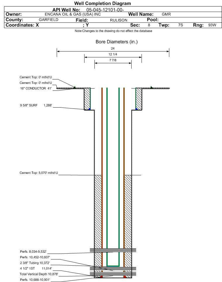 | Wellbore Completed | | Completion Date: | 8/30/2010 | | Spud Date: | 7/4/2010 | Spud Date Is: | ACTUAL | | Measured TD: | 11024 ft. | Measured PB depth: | 10986 ft. | | True Vertical TD: | 10878 ft. | True Vertical PB depth: | 10840 ft. | | Top PZ Location: | Sec:8 Twp: 7S 93W | Footage: 1926 FNL 1819 FWL | | Bottom Hole Location: | Sec:8 Twp: 7S 93W | Footage: 1935 FNL 1816 FWL | | Log Types: | RST & CBL logs. The LAS log uploaded to COGCC has both the RST and Cement Bond Log in the file. | | Casing: | String Type: CONDUCTOR, Hole Size: 24 in., Size: 16 in., Top: 0 ft., Depth: 41 ft., Weight: Linepipe , Citings Type: ACTUAL | | Cement: | Sacks: 4, Top: 0 ft., Bottom: 40 ft., Determination Method: CALC | | Casing: | String Type: SURF, Hole Size: 12.25 in., Size: 9.625 in., Top: 0 ft., Depth: 1288 ft., Weight: 36 , Citings Type: ACTUAL | | Cement: | Sacks: 413, Top: 0 ft., Bottom: 1300 ft., Determination Method: CALC | | Casing: | String Type: 1ST, Hole Size: 7.875 in., Size: 4.5 in., Top: 0 ft., Depth: 11014 ft., Weight: 11.6 , Citings Type: ACTUAL | | Cement: | Sacks: 983, Top: 5070 ft., Bottom: 11014 ft., Determination Method: CBL | | Formation | Interval Top | Log Bottom | Cored | DSTs | | WILLIAMS FORK | 6895 ft. | 9982 ft. | | | | ROLLINS | 9983 ft. | 10442 ft. | | | | COZZETTE | 10443 ft. | 10673 ft. | | | | CORCORAN | 10674 ft. | 11024 ft. | | |