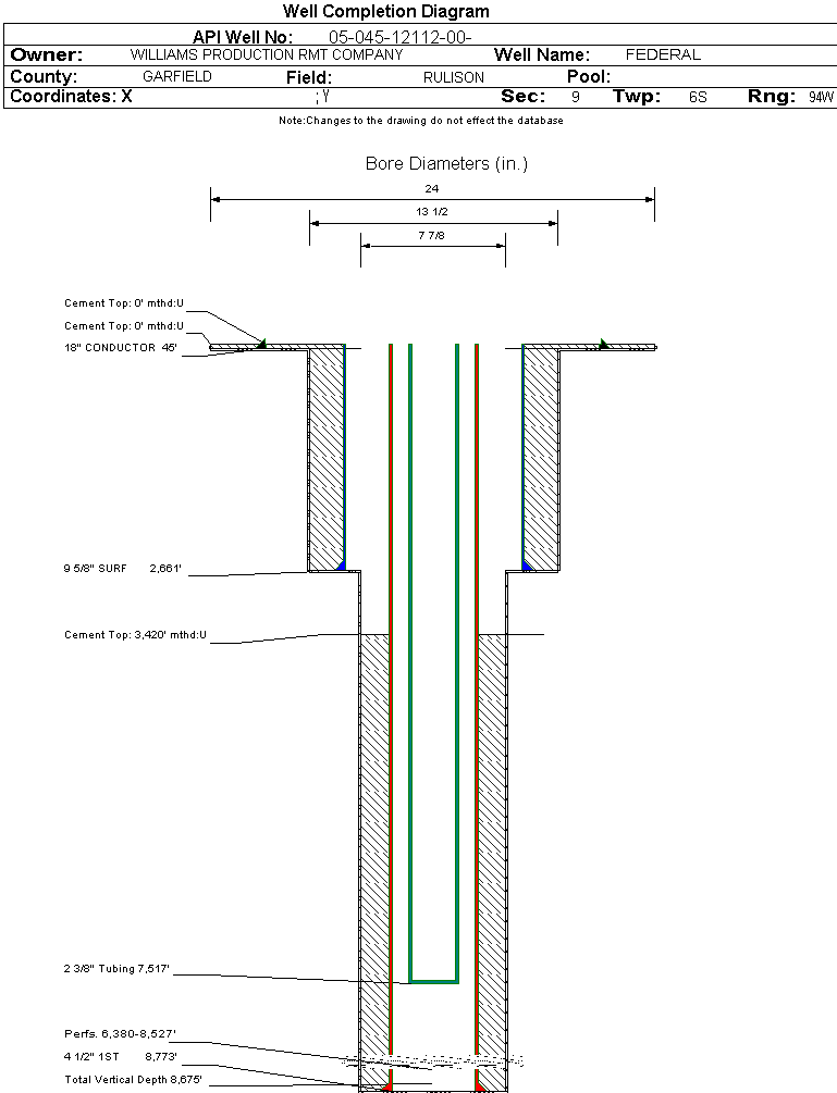 Wellbore #00 Wellbore Classification: GW Status: PR - 4/2/2007 Measured TD: 8792 ft. Vertical TD: 8675 ft.| Wellbore Data for Original Wellbore | Wellbore Classification: GW PR - 4/2/2007 | | Wellbore Permit | DIRECTIONAL | | Permit #: | 20071756 | Expiration Date: | 4/24/2008 | | Proposed Top PZ Location: | Sec: Twp: | Footage: 426 FNL 422 FWL | | Bottom Hole Location: | Sec:16 Twp: 6S 94W | Footage: 426 FNL 422 FWL | | Proposed Depth/Form: | 8747 ft. | | Surface Mineral Owner Same: | Yes | | Mineral Owner: | FEDERAL | Surface Owner: | FEDERAL | | Unit: | | Unit Number: | | | Formation And Spacing: | Code: WMFK , Formation: WILLIAMS FORK , Order: 510-9 , Unit Acreage: 320, Drill Unit: W2 |