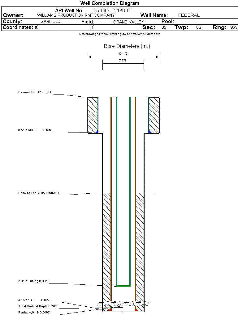 Wellbore #00 Wellbore Classification: GW Status: PR - 2/27/2006 Measured TD: 6840 ft. Vertical TD: 6707 ft.| Wellbore Data for Original Wellbore | Wellbore Classification: GW PR - 2/27/2006 | | Wellbore Permit | | | Permit #: | 20060979 | Expiration Date: | 4/17/2007 | | Proposed Top PZ Location: | Sec: Twp: | Footage: 1488 FSL 2589 FWL | | Bottom Hole Location: | Sec:35 Twp: 6S 96W | Footage: 1488 FSL 2589 FWL | | Proposed Depth/Form: | 6880 ft. | | Surface Mineral Owner Same: | Yes | | Mineral Owner: | FEDERAL | Surface Owner: | FEDERAL | | Unit: | | Unit Number: | | | Formation And Spacing: | Code: WMFK , Formation: WILLIAMS FORK , Order: 139-40 , Unit Acreage: 320, Drill Unit: S/2 |