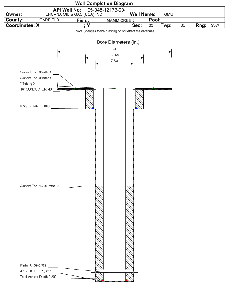 | Wellbore Completed | | Completion Date: | 9/16/2007 | | Spud Date: | 8/31/2007 | Spud Date Is: | ACTUAL | | Measured TD: | 9369 ft. | Measured PB depth: | | | True Vertical TD: | 9202 ft. | True Vertical PB depth: | | | Top PZ Location: | Sec:33 Twp: 6S 93W | Footage: 2629 FNL 335 FWL | | Bottom Hole Location: | Sec:33 Twp: 6S 93W | Footage: 2629 FNL 335 FWL | | Log Types: | RST & CBL | | Casing: | String Type: CONDUCTOR, Hole Size: 24 in., Size: 16 in., Top: 0 ft., Depth: 40 ft., Weight: , Citings Type: ACTUAL | | Cement: | Sacks: , Top: 0 ft., Bottom: 40 ft., Determination Method: CALC | | Casing: | String Type: SURF, Hole Size: 12.25 in., Size: 8.625 in., Top: 0 ft., Depth: 986 ft., Weight: , Citings Type: ACTUAL | | Cement: | Sacks: 715, Top: 0 ft., Bottom: 986 ft., Determination Method: CALC | | Casing: | String Type: 1ST, Hole Size: 7.875 in., Size: 4.5 in., Top: 0 ft., Depth: 9369 ft., Weight: , Citings Type: ACTUAL | | Cement: | Sacks: 810, Top: 4726 ft., Bottom: 9369 ft., Determination Method: CBL | | Formation | Interval Top | Log Bottom | Cored | DSTs | | WASATCH | 0 ft. | 6056 ft. | N | N | | WILLIAMS FORK | 6057 ft. | 9089 ft. | N | N | | ROLLINS | 9090 ft. | 9369 ft. | N | N |