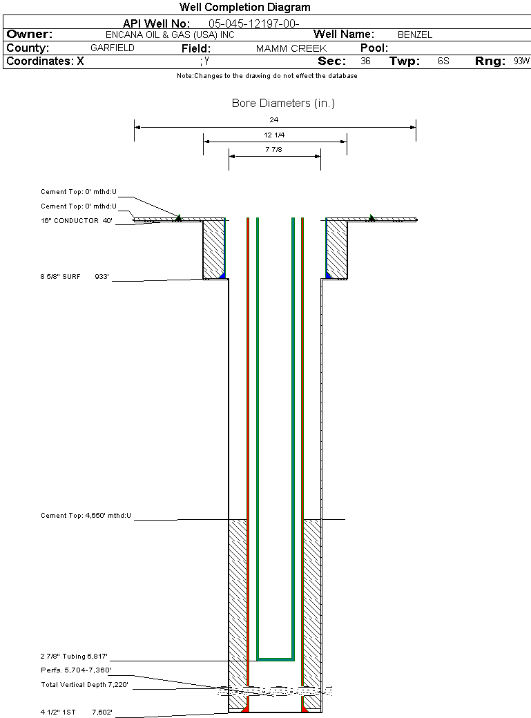 | Wellbore Completed | | Completion Date: | 12/29/2006 | | Spud Date: | 12/17/2006 | Spud Date Is: | ACTUAL | | Measured TD: | 7615 ft. | Measured PB depth: | 7553 ft. | | True Vertical TD: | 7220 ft. | True Vertical PB depth: | | | Top PZ Location: | Sec:36 Twp: 6S 93W | Footage: 420 FNL 34 FEL | | Bottom Hole Location: | Sec:36 Twp: 6S 93W | Footage: 420 FNL 34 FEL | | Log Types: | RST/GR/CCL/TEMP; CBL/GR/CCL/TEMP | | Casing: | String Type: CONDUCTOR, Hole Size: 24 in., Size: 16 in., Top: 0 ft., Depth: 40 ft., Weight: 42 , Citings Type: ACTUAL | | Cement: | Sacks: , Top: 0 ft., Bottom: 40 ft., Determination Method: CALC | | Casing: | String Type: SURF, Hole Size: 12.25 in., Size: 8.625 in., Top: 0 ft., Depth: 933 ft., Weight: 24 , Citings Type: ACTUAL | | Cement: | Sacks: 650, Top: 0 ft., Bottom: 933 ft., Determination Method: CALC | | Casing: | String Type: 1ST, Hole Size: 7.875 in., Size: 4.5 in., Top: 0 ft., Depth: 7602 ft., Weight: 11.6 , Citings Type: ACTUAL | | Cement: | Sacks: 820, Top: 4650 ft., Bottom: 7550 ft., Determination Method: CBL | | Formation | Interval Top | Log Bottom | Cored | DSTs | | WASATCH | 0 ft. | 4494 ft. | N | N | | WILLIAMS FORK | 4495 ft. | | N | N |