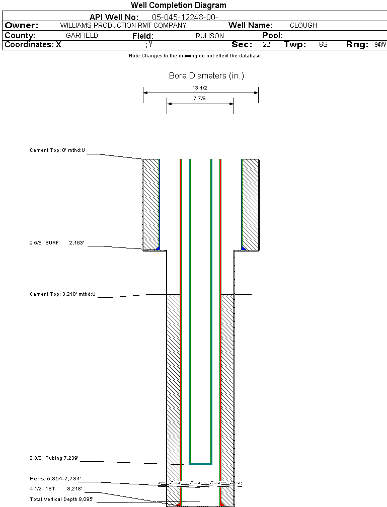 | Wellbore Completed | | Completion Date: | 9/9/2006 | | Spud Date: | 8/25/2006 | Spud Date Is: | ACTUAL | | Measured TD: | 8230 ft. | Measured PB depth: | 8016 ft. | | True Vertical TD: | 8095 ft. | True Vertical PB depth: | | | Top PZ Location: | Sec:22 Twp: 6S 94W | Footage: 2477 FSL 1969 FWL | | Bottom Hole Location: | Sec:22 Twp: 6S 94W | Footage: 2477 FSL 1969 FWL | | Log Types: | CBL; RESERVOIR MONITOR TOOL ELITE | | Casing: | String Type: SURF, Hole Size: 13.5 in., Size: 9.625 in., Top: 0 ft., Depth: 2163 ft., Weight: 32.3 , Citings Type: ACTUAL | | Cement: | Sacks: 564, Top: 0 ft., Bottom: 2163 ft., Determination Method: CALC | | Casing: | String Type: 1ST, Hole Size: 7.875 in., Size: 4.5 in., Top: 0 ft., Depth: 8218 ft., Weight: 11.6 , Citings Type: ACTUAL | | Cement: | Sacks: 1048, Top: 3210 ft., Bottom: 8218 ft., Determination Method: CBL | | Formation | Interval Top | Log Bottom | Cored | DSTs | | WASATCH G | 1883 ft. | | N | N | | MESAVERDE | 4446 ft. | | N | N | | CAMEO | 7257 ft. | | N | N |