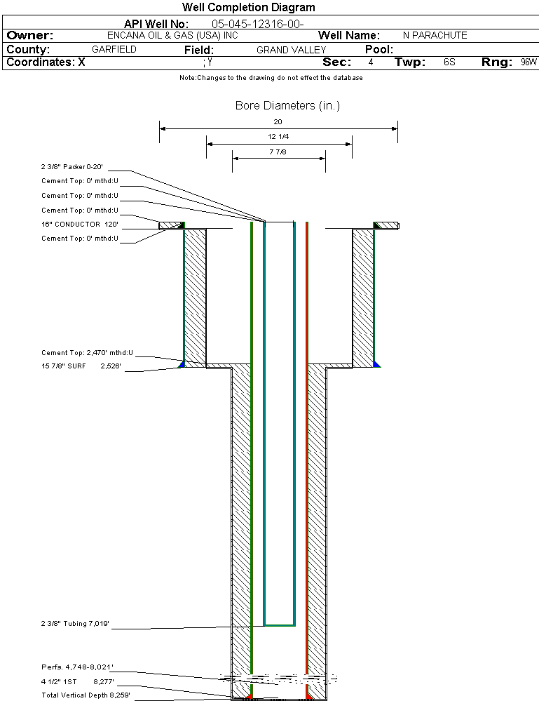 | Wellbore Completed | | Completion Date: | 12/5/2006 | | Spud Date: | 7/24/2006 | Spud Date Is: | ACTUAL | | Measured TD: | 8300 ft. | Measured PB depth: | 8255 ft. | | True Vertical TD: | 8259 ft. | True Vertical PB depth: | 8214 ft. | | Top PZ Location: | Sec:4 Twp: 6S 96W | Footage: 1703 FSL 2412 FEL | | Bottom Hole Location: | Sec:4 Twp: 6S 96W | Footage: 1703 FSL 2412 FEL | | Log Types: | CBL & MUD | | Casing: | String Type: CONDUCTOR, Hole Size: 20 in., Size: 16 in., Top: 0 ft., Depth: 120 ft., Weight: , Citings Type: ACTUAL | | Cement: | Sacks: 6, Top: 0 ft., Bottom: 120 ft., Determination Method: CALC | | Casing: | String Type: SURF, Hole Size: 12.25 in., Size: 9.625 in., Top: 0 ft., Depth: 2526 ft., Weight: , Citings Type: ACTUAL | | Cement: | Sacks: 660, Top: 0 ft., Bottom: 2527 ft., Determination Method: CALC | | Casing: | String Type: 1ST, Hole Size: 7.875 in., Size: 4.5 in., Top: 0 ft., Depth: 8277 ft., Weight: , Citings Type: ACTUAL | | Cement: | Sacks: 1030, Top: 2470 ft., Bottom: 8277 ft., Determination Method: CBL | | Casing: | String Type: 2ND, Hole Size: , Size: , Top: 0 ft., Depth: , Weight: , Citings Type: ACTUAL | | Cement: | Sacks: , Top: , Bottom: , Determination Method: | | Casing: | String Type: 3RD, Hole Size: , Size: , Top: 0 ft., Depth: , Weight: , Citings Type: ACTUAL | | Cement: | Sacks: , Top: , Bottom: , Determination Method: | | Casing: | String Type: 1ST LINER, Hole Size: , Size: , Top: 0 ft., Depth: , Weight: , Citings Type: ACTUAL | | Cement: | Sacks: , Top: , Bottom: , Determination Method: | | Formation | Interval Top | Log Bottom | Cored | DSTs | | WILLIAMS FORK | 4701 ft. | 8109 ft. | N | N | | ROLLINS | 8109 ft. | 8300 ft. | N | N |