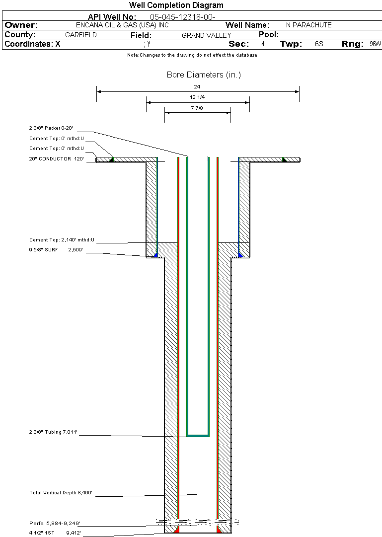| Wellbore Completed | | Completion Date: | 1/28/2007 | | Spud Date: | 9/28/2006 | Spud Date Is: | ACTUAL | | Measured TD: | 9430 ft. | Measured PB depth: | 9360 ft. | | True Vertical TD: | 8460 ft. | True Vertical PB depth: | | | Top PZ Location: | Sec:4 Twp: 6S 96W | Footage: 2526 FNL 572 FEL | | Bottom Hole Location: | Sec:4 Twp: 6S 96W | Footage: 2526 FNL 572 FEL | | Log Types: | MUD, CBL | | Casing: | String Type: CONDUCTOR, Hole Size: 24 in., Size: 20 in., Top: 0 ft., Depth: 120 ft., Weight: , Citings Type: ACTUAL | | Cement: | Sacks: 360, Top: 0 ft., Bottom: 120 ft., Determination Method: CALC | | Casing: | String Type: SURF, Hole Size: 12.25 in., Size: 9.625 in., Top: 0 ft., Depth: 2509 ft., Weight: , Citings Type: ACTUAL | | Cement: | Sacks: 660, Top: 0 ft., Bottom: 2520 ft., Determination Method: CALC | | Casing: | String Type: 1ST, Hole Size: 7.875 in., Size: 4.5 in., Top: 0 ft., Depth: 9412 ft., Weight: , Citings Type: ACTUAL | | Cement: | Sacks: 1420, Top: 2140 ft., Bottom: 9430 ft., Determination Method: CBL | | Formation | Interval Top | Log Bottom | Cored | DSTs | | WILLIAMS FORK | 5778 ft. | 9323 ft. | N | N | | ROLLINS | 9323 ft. | 9430 ft. | N | N |