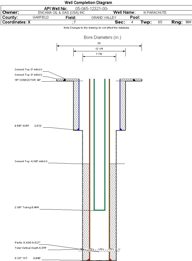 | Wellbore Completed | | Completion Date: | 8/30/2006 | | Spud Date: | 8/16/2006 | Spud Date Is: | ACTUAL | | Measured TD: | 8970 ft. | Measured PB depth: | 8905 ft. | | True Vertical TD: | 8376 ft. | True Vertical PB depth: | 8311 ft. | | Top PZ Location: | Sec:4 Twp: 6S 96W | Footage: 2958 FNL 1093 FEL | | Bottom Hole Location: | Sec:4 Twp: 6S 96W | Footage: 2958 FNL 1093 FEL | | Log Types: | MUDLOG & CBL | | Casing: | String Type: CONDUCTOR, Hole Size: 20 in., Size: 16 in., Top: 0 ft., Depth: 90 ft., Weight: , Citings Type: ACTUAL | | Cement: | Sacks: , Top: 0 ft., Bottom: 90 ft., Determination Method: CALC | | Casing: | String Type: SURF, Hole Size: 12.25 in., Size: 9.625 in., Top: 0 ft., Depth: 2512 ft., Weight: 36 , Citings Type: ACTUAL | | Cement: | Sacks: 700, Top: 0 ft., Bottom: 2512 ft., Determination Method: CALC | | Casing: | String Type: 1ST, Hole Size: 7.875 in., Size: 4.5 in., Top: 0 ft., Depth: 8948 ft., Weight: 11.6 , Citings Type: ACTUAL | | Cement: | Sacks: 1372, Top: 4185 ft., Bottom: 8948 ft., Determination Method: CBL | | Formation | Interval Top | Log Bottom | Cored | DSTs | | WILLIAMS FORK | 5322 ft. | 8814 ft. | N | N | | ROLLINS | 8814 ft. | 8970 ft. | N | N |