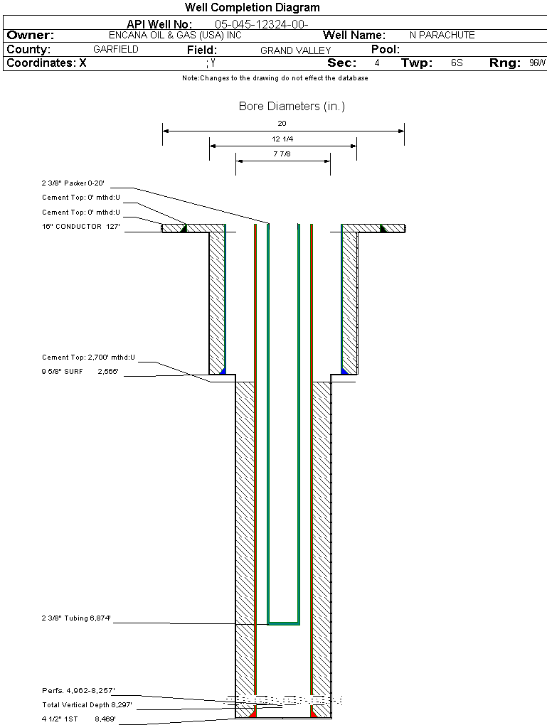 | Wellbore Completed | | Completion Date: | 2/17/2007 | | Spud Date: | 12/17/2006 | Spud Date Is: | ACTUAL | | Measured TD: | 8480 ft. | Measured PB depth: | 8447 ft. | | True Vertical TD: | 8297 ft. | True Vertical PB depth: | | | Top PZ Location: | Sec:4 Twp: 6S 96W | Footage: 3423 FNL 2358 FWL | | Bottom Hole Location: | Sec:4 Twp: 6S 96W | Footage: 3423 FNL 2358 FWL | | Log Types: | CBL; MUDLOG | | Log Types: | | | Casing: | String Type: CONDUCTOR, Hole Size: 20 in., Size: 16 in., Top: 0 ft., Depth: 127 ft., Weight: , Citings Type: ACTUAL | | Cement: | Sacks: 6, Top: , Bottom: 127 ft., Determination Method: CALC | | Casing: | String Type: SURF, Hole Size: 12.25 in., Size: 9.625 in., Top: 0 ft., Depth: 2565 ft., Weight: , Citings Type: ACTUAL | | Cement: | Sacks: 660, Top: 0 ft., Bottom: 2575 ft., Determination Method: CALC | | Casing: | String Type: 1ST, Hole Size: 7.875 in., Size: 4.5 in., Top: 0 ft., Depth: 8469 ft., Weight: , Citings Type: ACTUAL | | Cement: | Sacks: 875, Top: 2700 ft., Bottom: 8469 ft., Determination Method: CBL | | Formation | Interval Top | Log Bottom | Cored | DSTs | | WILLIAMS FORK | 4811 ft. | 8344 ft. | N | N | | ROLLINS | 8344 ft. | | N | N |