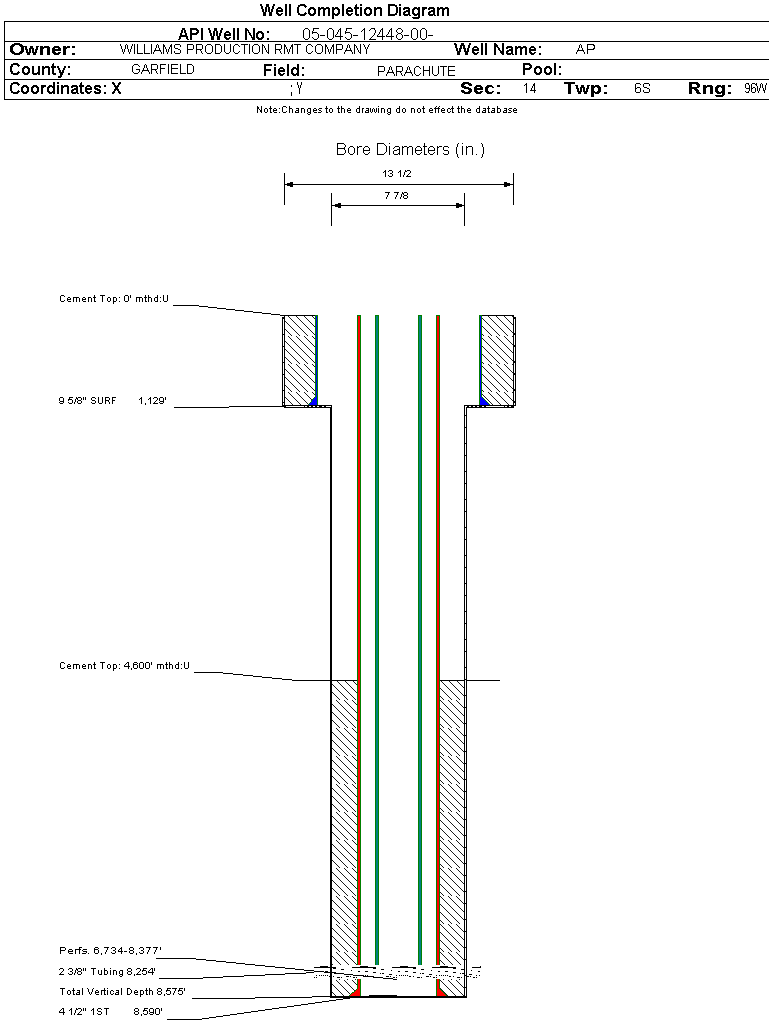 Wellbore #00 Wellbore Classification: GW Status: PR - 4/25/2006 Measured TD: 8590 ft. Vertical TD: 8575 ft.| Wellbore Data for Original Wellbore | Wellbore Classification: GW PR - 4/25/2006 | | Wellbore Permit | DIRECTIONAL | | Permit #: | 20062041 | Expiration Date: | 6/22/2007 | | Proposed Top PZ Location: | Sec: Twp: | Footage: 550 FSL 1688 FEL | | Bottom Hole Location: | Sec:14 Twp: 6S 96W | Footage: 550 FSL 1688 FEL | | Proposed Depth/Form: | 8652 ft. | | Surface Mineral Owner Same: | Yes | | Mineral Owner: | FEE | Surface Owner: | FEE | | Unit: | | Unit Number: | | | Formation And Spacing: | Code: WMFK , Formation: WILLIAMS FORK , Order: 510-12 , Unit Acreage: , Drill Unit: |