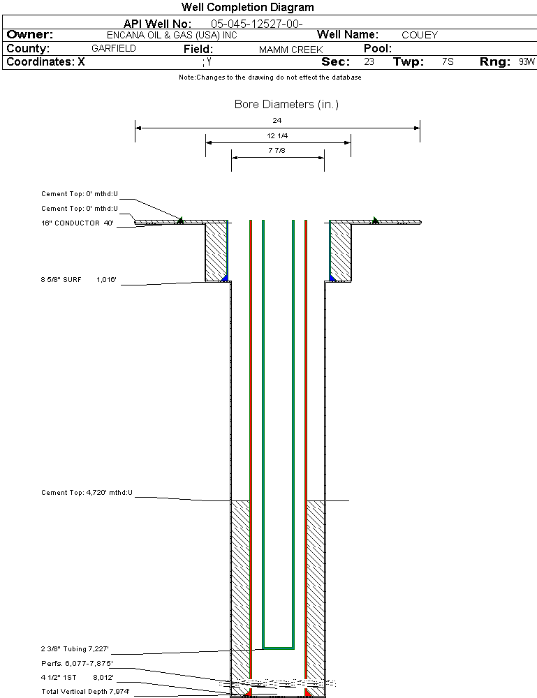 | Wellbore Completed | | Completion Date: | 4/18/2007 | | Spud Date: | 4/6/2007 | Spud Date Is: | ACTUAL | | Measured TD: | 8012 ft. | Measured PB depth: | | | True Vertical TD: | 7974 ft. | True Vertical PB depth: | | | Top PZ Location: | Sec:23 Twp: 7S 93W | Footage: 2520 FNL 601 FEL | | Bottom Hole Location: | Sec:23 Twp: 7S 93W | Footage: 2520 FNL 601 FEL | | Log Types: | RST; CBL/TEMP | | Casing: | String Type: CONDUCTOR, Hole Size: 24 in., Size: 16 in., Top: 0 ft., Depth: 40 ft., Weight: , Citings Type: ACTUAL | | Cement: | Sacks: 4, Top: 0 ft., Bottom: 40 ft., Determination Method: CALC | | Casing: | String Type: SURF, Hole Size: 12.25 in., Size: 8.625 in., Top: 0 ft., Depth: 1016 ft., Weight: 24 , Citings Type: ACTUAL | | Cement: | Sacks: 710, Top: 0 ft., Bottom: 1035 ft., Determination Method: CALC | | Casing: | String Type: 1ST, Hole Size: 7.875 in., Size: 4.5 in., Top: 0 ft., Depth: 8012 ft., Weight: 11.6 , Citings Type: ACTUAL | | Cement: | Sacks: 600, Top: 4720 ft., Bottom: 8012 ft., Determination Method: CBL | | Formation | Interval Top | Log Bottom | Cored | DSTs | | WASATCH | 0 ft. | 5156 ft. | N | N | | WILLIAMS FORK | 5157 ft. | 8012 ft. | N | N |