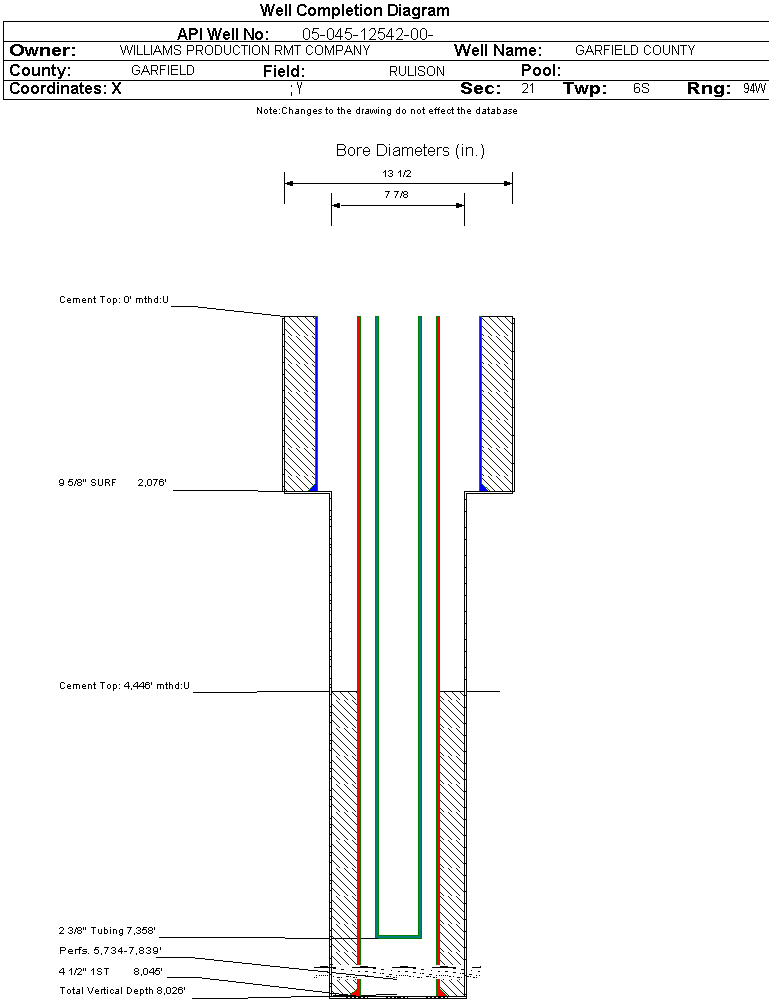 | | Tubing Size: | 2.375 in. | Tubing Setting Depth: | 7358 ft. | | Tubing Packer Depth: | | Tubing Multiple Packer: | | | Open Hole Top: | | Open Hole Bottom: | | | Initial Test Data: | | Test Date: | 2/15/2007 | Test Method: | FLOWING | | Hours Tested: | 24 | Gas Type: | DRY | | Gas Disposal: | SOLD | |