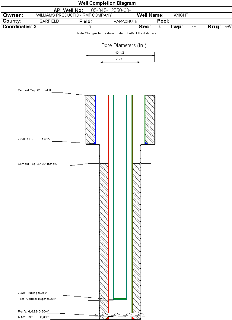 Wellbore #00 Wellbore Classification: GW Status: PR - 5/19/2006 Measured TD: 6999 ft. Vertical TD: 6381 ft.| Wellbore Data for Original Wellbore | Wellbore Classification: GW PR - 5/19/2006 | | Wellbore Permit | DIRECTIONAL | | Permit #: | 20062520 | Expiration Date: | 7/18/2007 | | Proposed Top PZ Location: | Sec: Twp: | Footage: 2376 FNL 2068 FEL | | Bottom Hole Location: | Sec:4 Twp: 7S 95W | Footage: 2376 FNL 2068 FEL | | Proposed Depth/Form: | 7149 ft. | | Surface Mineral Owner Same: | Yes | | Mineral Owner: | FEE | Surface Owner: | FEE | | Unit: | | Unit Number: | | | Formation And Spacing: | Code: WMFK , Formation: WILLIAMS FORK , Order: 510-12 , Unit Acreage: 640, Drill Unit: SEC. |
