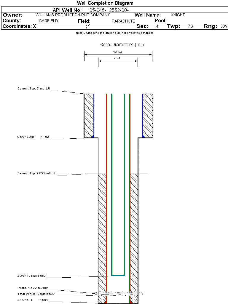 Wellbore #00 Wellbore Classification: GW Status: PR - 5/16/2006 Measured TD: 6979 ft. Vertical TD: 6682 ft.| Wellbore Data for Original Wellbore | Wellbore Classification: GW PR - 5/16/2006 | | Wellbore Permit | DIRECTIONAL | | Permit #: | 20062530 | Expiration Date: | 7/18/2007 | | Proposed Top PZ Location: | Sec: Twp: | Footage: 2032 FNL 774 FEL | | Bottom Hole Location: | Sec:4 Twp: 7S 95W | Footage: 2032 FNL 774 FEL | | Proposed Depth/Form: | 6898 ft. | | Surface Mineral Owner Same: | Yes | | Mineral Owner: | FEE | Surface Owner: | FEE | | Unit: | | Unit Number: | | | Formation And Spacing: | Code: WMFK , Formation: WILLIAMS FORK , Order: 510-12 , Unit Acreage: 640, Drill Unit: SEC. |