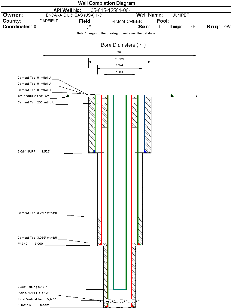 | Wellbore Completed | | Completion Date: | 10/23/2006 | | Spud Date: | 10/1/2006 | Spud Date Is: | ACTUAL | | Measured TD: | 5657 ft. | Measured PB depth: | 5618 ft. | | True Vertical TD: | 5462 ft. | True Vertical PB depth: | | | Top PZ Location: | Sec:2 Twp: 7S 92W | Footage: 647 FSL 662 FEL | | Bottom Hole Location: | Sec:2 Twp: 7S 92W | Footage: 647 FSL 662 FEL | | Log Types: | RSAT/GR/CCL; CBL/PRESS/TEMP/GR/CCL; 2-CBL/GR/CCL; TEMP/GR/CCL | | Casing: | String Type: CONDUCTOR, Hole Size: 30 in., Size: 20 in., Top: 0 ft., Depth: 40 ft., Weight: 52.7 , Citings Type: ACTUAL | | Cement: | Sacks: 30, Top: 0 ft., Bottom: 40 ft., Determination Method: CALC | | Casing: | String Type: SURF, Hole Size: 12.25 in., Size: 9.625 in., Top: 0 ft., Depth: 1529 ft., Weight: 36 , Citings Type: ACTUAL | | Cement: | Sacks: 815, Top: 0 ft., Bottom: 1529 ft., Determination Method: CALC | | Casing: | String Type: 1ST, Hole Size: 6.125 in., Size: 4.5 in., Top: 0 ft., Depth: 5655 ft., Weight: 11.6 , Citings Type: ACTUAL | | Cement: | Sacks: 240, Top: 3936 ft., Bottom: 5657 ft., Determination Method: CBL | | Casing: | String Type: S.C. 1.1, Hole Size: , Size: , Top: , Depth: 850 ft., Weight: , Citings Type: ACTUAL | | Cement: | Sacks: 59, Top: 200 ft., Bottom: 850 ft., Determination Method: CALC | | Casing: | String Type: S.C. 1.2, Hole Size: , Size: , Top: , Depth: 85 ft., Weight: , Citings Type: ACTUAL | | Cement: | Sacks: 149, Top: 0 ft., Bottom: 85 ft., Determination Method: CALC | | Casing: | String Type: 2ND, Hole Size: 8.75 in., Size: 7 in., Top: 0 ft., Depth: 3999 ft., Weight: 23 , Citings Type: ACTUAL | | Cement: | Sacks: 185, Top: 3250 ft., Bottom: 4000 ft., Determination Method: CALC | | Formation | Interval Top | Log Bottom | Cored | DSTs | | WASATCH | 0 ft. | 3336 ft. | N | N | | WILLIAMS FORK | 3337 ft. | | N | N |