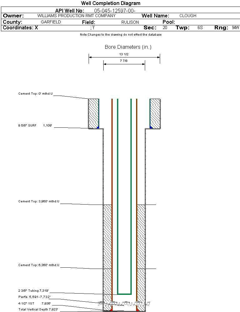 Wellbore #00 Wellbore Classification: GW Status: PR - 5/30/2006 Measured TD: 7950 ft. Vertical TD: 7923 ft.| Wellbore Data for Original Wellbore | Wellbore Classification: GW PR - 5/30/2006 | | Wellbore Permit | DIRECTIONAL | | Permit #: | 20062692 | Expiration Date: | 8/1/2007 | | Proposed Top PZ Location: | Sec: Twp: | Footage: 477 FSL 2111 FWL | | Bottom Hole Location: | Sec:20 Twp: 6S 94W | Footage: 477 FSL 2111 FWL | | Proposed Depth/Form: | 7915 ft. | | Surface Mineral Owner Same: | No | | Mineral Owner: | FEE | Surface Owner: | FEE | | Unit: | | Unit Number: | | | Formation And Spacing: | Code: WMFK , Formation: WILLIAMS FORK , Order: 510-6 , Unit Acreage: 320, Drill Unit: W2 |