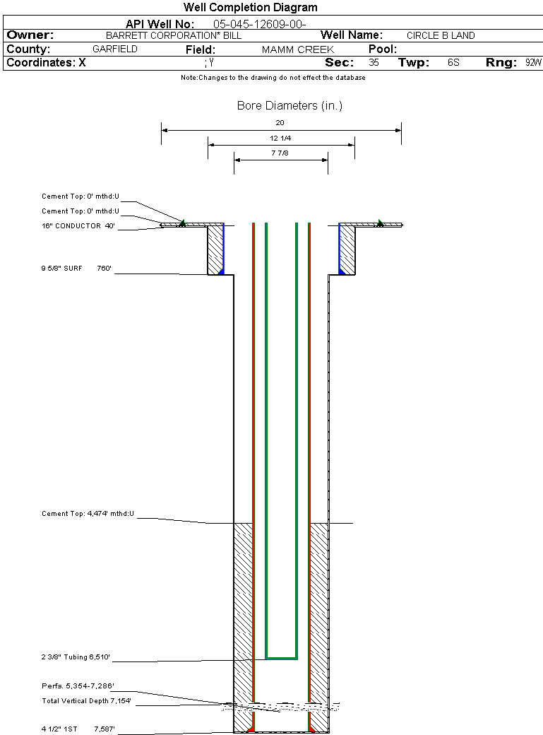 Wellbore #00 Wellbore Classification: GW Status: PR - 2/10/2007 Measured TD: 7600 ft. Vertical TD: 7154 ft.| Wellbore Data for Original Wellbore | Wellbore Classification: GW PR - 2/10/2007 | | Wellbore Permit | | | Permit #: | 20062777 | Expiration Date: | 8/7/2007 | | Proposed Top PZ Location: | Sec: Twp: | Footage: 492 FNL 1991 FWL | | Bottom Hole Location: | Sec:35 Twp: 6S 92W | Footage: 492 FNL 1991 FWL | | Proposed Depth/Form: | 7583 ft. | | Surface Mineral Owner Same: | No | | Mineral Owner: | FEE | Surface Owner: | FEE | | Unit: | | Unit Number: | | | Formation And Spacing: | Code: ILES , Formation: ILES , Order: 191-10 , Unit Acreage: 640, Drill Unit: ALL | | Formation And Spacing: | Code: WMFK , Formation: WILLIAMS FORK , Order: 191-8 , Unit Acreage: 640, Drill Unit: ALL |