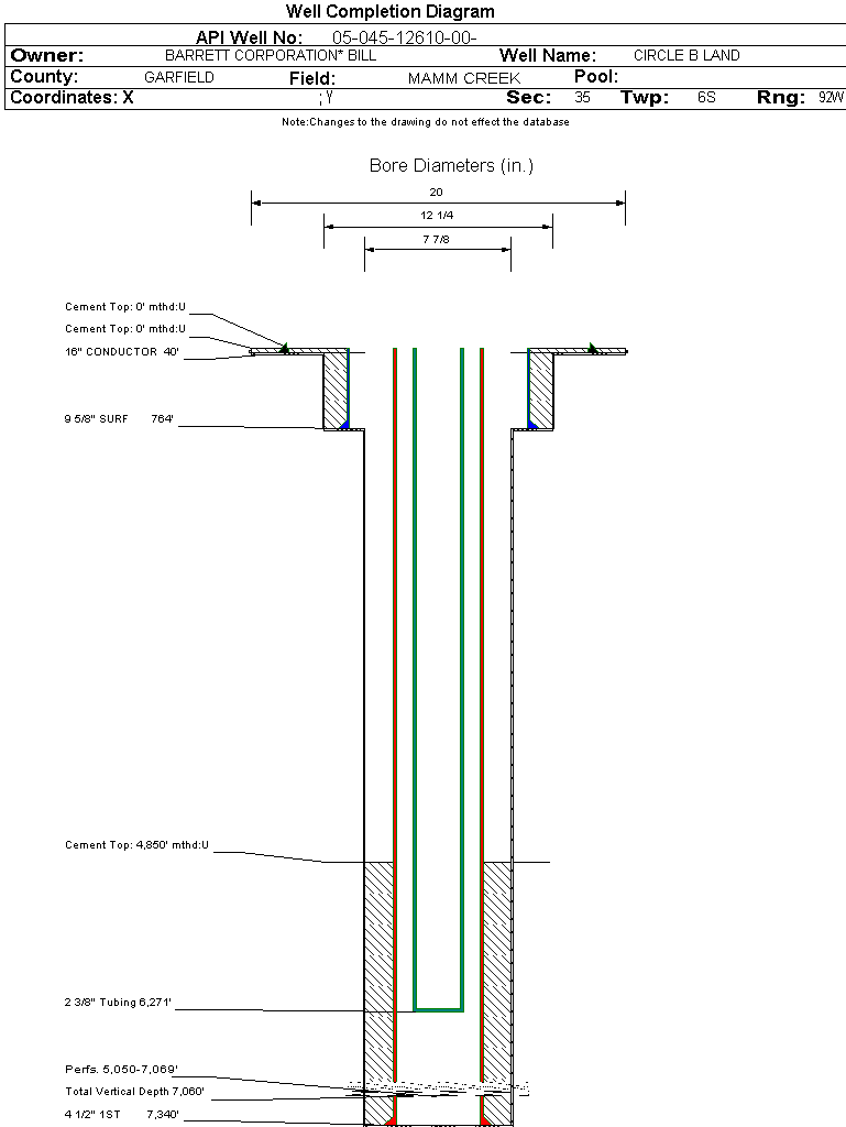 Wellbore #00 Wellbore Classification: GW Status: PR - 10/1/2024 Measured TD: 7350 ft. Vertical TD: 7060 ft.| Wellbore Data for Original Wellbore | Wellbore Classification: GW PR - 10/1/2024 | | Wellbore Permit | DIRECTIONAL | | Permit #: | 20062776 | Expiration Date: | 8/7/2007 | | Proposed Top PZ Location: | Sec: Twp: | Footage: 1147 FNL 1990 FWL | | Bottom Hole Location: | Sec:35 Twp: 6S 92W | Footage: 1147 FNL 1990 FWL | | Proposed Depth/Form: | 7353 ft. | | Surface Mineral Owner Same: | No | | Mineral Owner: | FEE | Surface Owner: | FEE | | Unit: | | Unit Number: | | | Formation And Spacing: | Code: ILES , Formation: ILES , Order: 191-10 , Unit Acreage: 640, Drill Unit: ALL | | Formation And Spacing: | Code: WMFK , Formation: WILLIAMS FORK , Order: 191-8 , Unit Acreage: 640, Drill Unit: ALL |