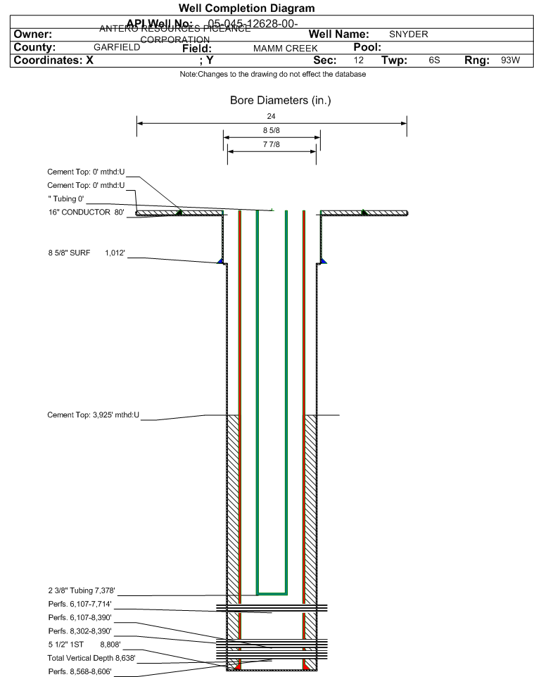 Wellbore #00 Wellbore Classification: GW Status: PR - 5/1/2020 Measured TD: 8820 ft. Vertical TD: 8638 ft.| Wellbore Data for Original Wellbore | Wellbore Classification: GW PR - 5/1/2020 | | Wellbore Permit | DIRECTIONAL | | Permit #: | 20073149 | Expiration Date: | 7/29/2008 | | Proposed Top PZ Location: | Sec: Twp: | Footage: 150 FNL 871 FEL | | Bottom Hole Location: | Sec:13 Twp: 6S 93W | Footage: 150 FNL 871 FEL | | Proposed Depth/Form: | 8726 ft. | | Surface Mineral Owner Same: | Yes | | Mineral Owner: | FEE | Surface Owner: | FEE | | Unit: | | Unit Number: | | | Formation And Spacing: | Code: COZZ , Formation: COZZETTE , Order: 191-25 , Unit Acreage: , Drill Unit: | | Formation And Spacing: | Code: CRCRN , Formation: CORCORAN , Order: 191-25 , Unit Acreage: , Drill Unit: | | Formation And Spacing: | Code: ILES , Formation: ILES , Order: 191-25 , Unit Acreage: 320, Drill Unit: N/2 | | Formation And Spacing: | Code: RLNS , Formation: ROLLINS , Order: 191-25 , Unit Acreage: , Drill Unit: | | Formation And Spacing: | Code: WMFK , Formation: WILLIAMS FORK , Order: 191-14 , Unit Acreage: 320, Drill Unit: N/2 |