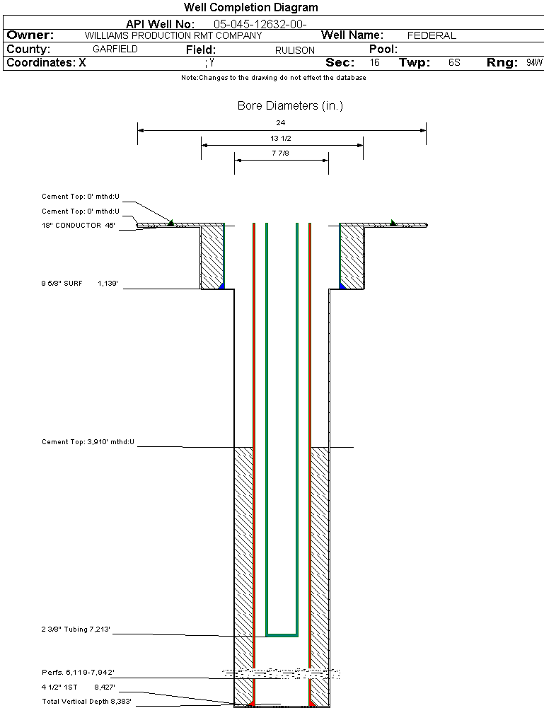 | Wellbore Completed | | Completion Date: | 10/6/2007 | | Spud Date: | 9/22/2007 | Spud Date Is: | ACTUAL | | Measured TD: | 8395 ft. | Measured PB depth: | 8115 ft. | | True Vertical TD: | 8383 ft. | True Vertical PB depth: | | | Top PZ Location: | Sec:16 Twp: 6S 94W | Footage: 1595 FNL 2210 FWL | | Bottom Hole Location: | Sec:16 Twp: 6S 94W | Footage: 1595 FNL 2210 FWL | | Log Types: | CBL, HIGH RESOLUTION INDUCTION, SPECTRAL DENSITY,DUAL SPACED NEUTRON, MUD | | Casing: | String Type: CONDUCTOR, Hole Size: 24 in., Size: 18 in., Top: , Depth: 45 ft., Weight: 48 , Citings Type: ACTUAL | | Cement: | Sacks: 25, Top: 0 ft., Bottom: 45 ft., Determination Method: | | Casing: | String Type: SURF, Hole Size: 13.5 in., Size: 9.625 in., Top: 0 ft., Depth: 1139 ft., Weight: , Citings Type: ACTUAL | | Cement: | Sacks: 375, Top: 0 ft., Bottom: 1138 ft., Determination Method: | | Casing: | String Type: 1ST, Hole Size: 7.875 in., Size: 4.5 in., Top: 0 ft., Depth: 8427 ft., Weight: , Citings Type: ACTUAL | | Cement: | Sacks: 1309, Top: 3910 ft., Bottom: 8427 ft., Determination Method: CBL | | Formation | Interval Top | Log Bottom | Cored | DSTs | | WASATCH G | 2131 ft. | | N | N | | WILLIAMS FORK | 4618 ft. | | N | N | | CAMEO | 7431 ft. | | N | N | | ROLLINS | 8366 ft. | | N | N |