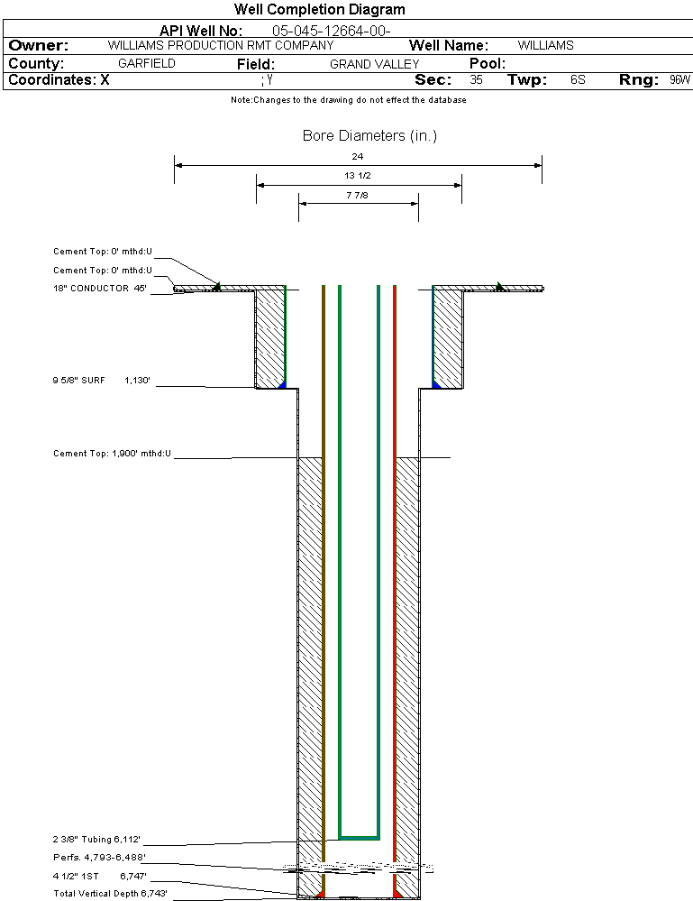 Wellbore #00 Wellbore Classification: GW Status: PR - 5/1/2024 Measured TD: 6754 ft. Vertical TD: 6743 ft.| Wellbore Data for Original Wellbore | Wellbore Classification: GW PR - 5/1/2024 | | Wellbore Permit | DIRECTIONAL | | Permit #: | 20063141 | Expiration Date: | 8/27/2007 | | Proposed Top PZ Location: | Sec: Twp: | Footage: 1072 FSL 1361 FEL | | Bottom Hole Location: | Sec:35 Twp: 6S 96W | Footage: 1072 FSL 1361 FEL | | Proposed Depth/Form: | 6754 ft. | | Surface Mineral Owner Same: | No | | Mineral Owner: | FEDERAL | Surface Owner: | FEE | | Unit: | | Unit Number: | | | Formation And Spacing: | Code: WMFK , Formation: WILLIAMS FORK , Order: 510-9 , Unit Acreage: 320, Drill Unit: S2 |