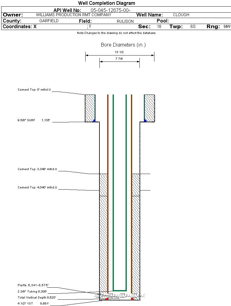 Wellbore #00 Wellbore Classification: GW Status: PR - 6/20/2006 Measured TD: 8695 ft. Vertical TD: 8620 ft.| Wellbore Data for Original Wellbore | Wellbore Classification: GW PR - 6/20/2006 | | Wellbore Permit | DIRECTIONAL | | Permit #: | 20063091 | Expiration Date: | 8/27/2007 | | Proposed Top PZ Location: | Sec: Twp: | Footage: 2378 FNL 1793 FEL | | Bottom Hole Location: | Sec:18 Twp: 6S 94W | Footage: 2378 FNL 1793 FEL | | Proposed Depth/Form: | 8723 ft. | | Surface Mineral Owner Same: | Not available | | Mineral Owner: | FEE | Surface Owner: | FEDERAL | | Unit: | | Unit Number: | | | Formation And Spacing: | Code: WMFK , Formation: WILLIAMS FORK , Order: 510-9 , Unit Acreage: 320, Drill Unit: N2 |