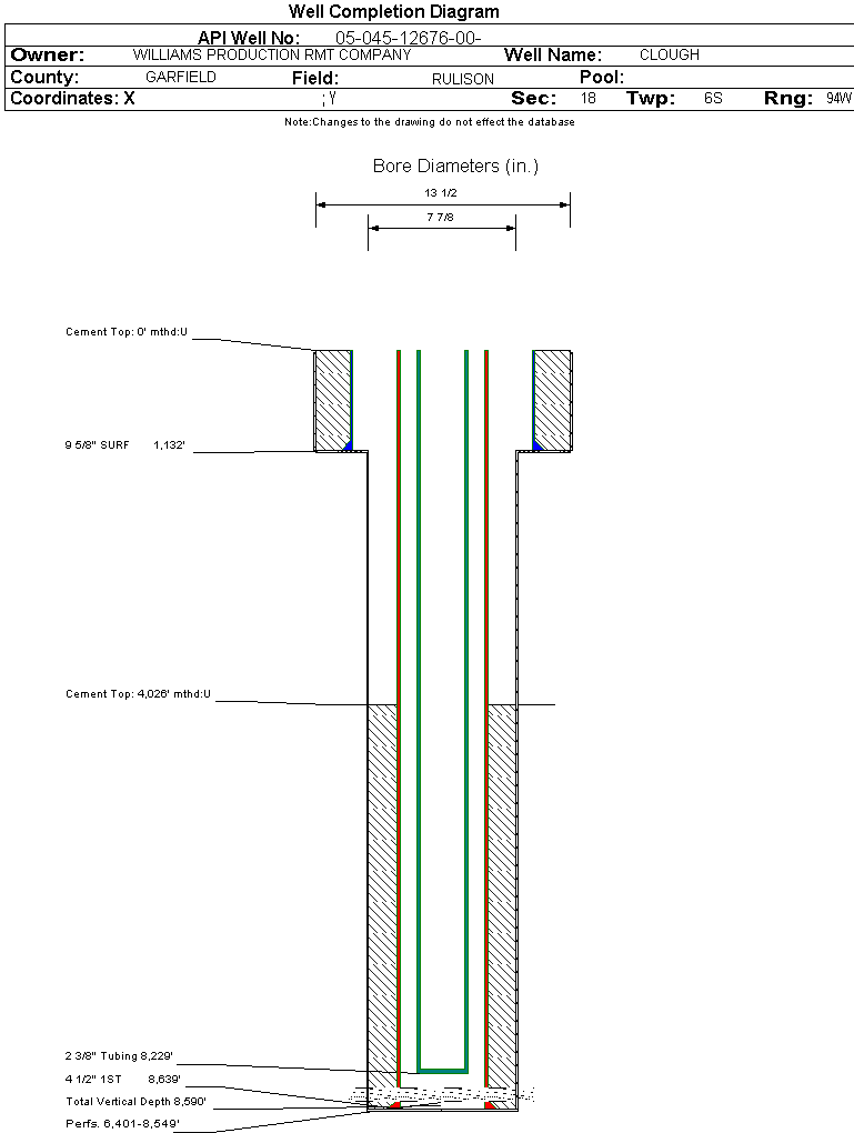 Wellbore #00 Wellbore Classification: GW Status: PR - 6/20/2006 Measured TD: 8652 ft. Vertical TD: 8590 ft.| Wellbore Data for Original Wellbore | Wellbore Classification: GW PR - 6/20/2006 | | Wellbore Permit | DIRECTIONAL | | Permit #: | 20063090 | Expiration Date: | 8/27/2007 | | Proposed Top PZ Location: | Sec: Twp: | Footage: 1885 FSL 1605 FWL | | Bottom Hole Location: | Sec:18 Twp: 6S 94W | Footage: 1885 FSL 1605 FWL | | Proposed Depth/Form: | 8667 ft. | | Surface Mineral Owner Same: | No | | Mineral Owner: | FEE | Surface Owner: | STATE | | Unit: | | Unit Number: | | | Formation And Spacing: | Code: WMFK , Formation: WILLIAMS FORK , Order: 510-9 , Unit Acreage: 320, Drill Unit: S2 |