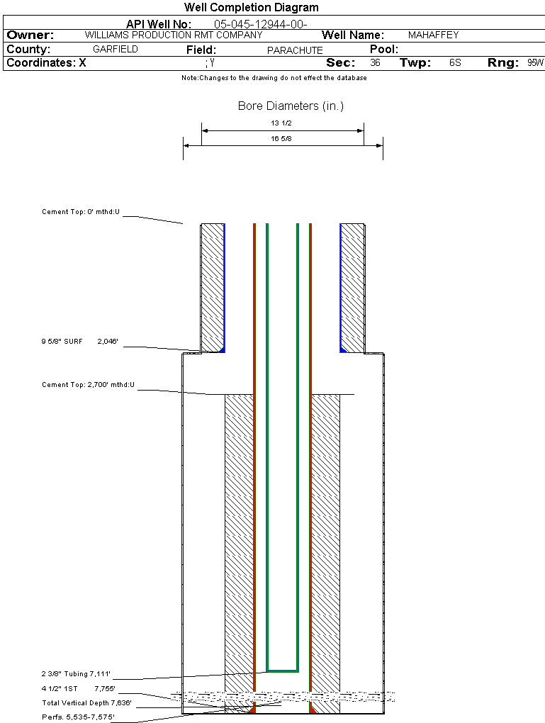 Wellbore #00 Wellbore Classification: GW Status: PR - 8/24/2006 Measured TD: 7768 ft. Vertical TD: 7636 ft.| Wellbore Data for Original Wellbore | Wellbore Classification: GW PR - 8/24/2006 | | Wellbore Permit | DIRECTIONAL | | Permit #: | 20064356 | Expiration Date: | 10/3/2007 | | Proposed Top PZ Location: | Sec: Twp: | Footage: 1235 FSL 2061 FWL | | Bottom Hole Location: | Sec:36 Twp: 6 95W | Footage: 1235 FSL 2061 FWL | | Proposed Depth/Form: | 7757 ft. | | Surface Mineral Owner Same: | No | | Mineral Owner: | FEE | Surface Owner: | FEE | | Unit: | | Unit Number: | | | Formation And Spacing: | Code: WMFK , Formation: WILLIAMS FORK , Order: 440-35 , Unit Acreage: 320, Drill Unit: S2 |