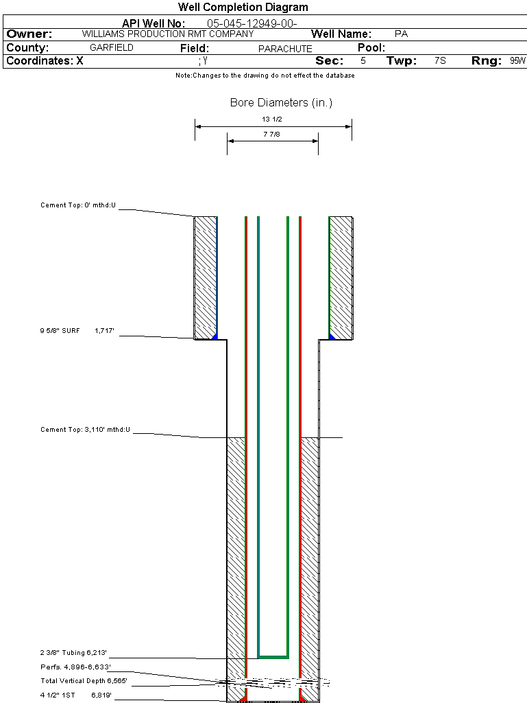 Wellbore #00 Wellbore Classification: GW Status: PR - 8/25/2006 Measured TD: 6850 ft. Vertical TD: 6565 ft.| Wellbore Data for Original Wellbore | Wellbore Classification: GW PR - 8/25/2006 | | Wellbore Permit | DIRECTIONAL | | Permit #: | 20064397 | Expiration Date: | 10/4/2007 | | Proposed Top PZ Location: | Sec: Twp: | Footage: 2057 FNL 347 FWL | | Bottom Hole Location: | Sec:5 Twp: 7S 95W | Footage: 2057 FNL 347 FWL | | Proposed Depth/Form: | 6835 ft. | | Surface Mineral Owner Same: | No | | Mineral Owner: | FEE | Surface Owner: | FEE | | Unit: | | Unit Number: | | | Formation And Spacing: | Code: WMFK , Formation: WILLIAMS FORK , Order: 510-12 , Unit Acreage: 320, Drill Unit: N2 |