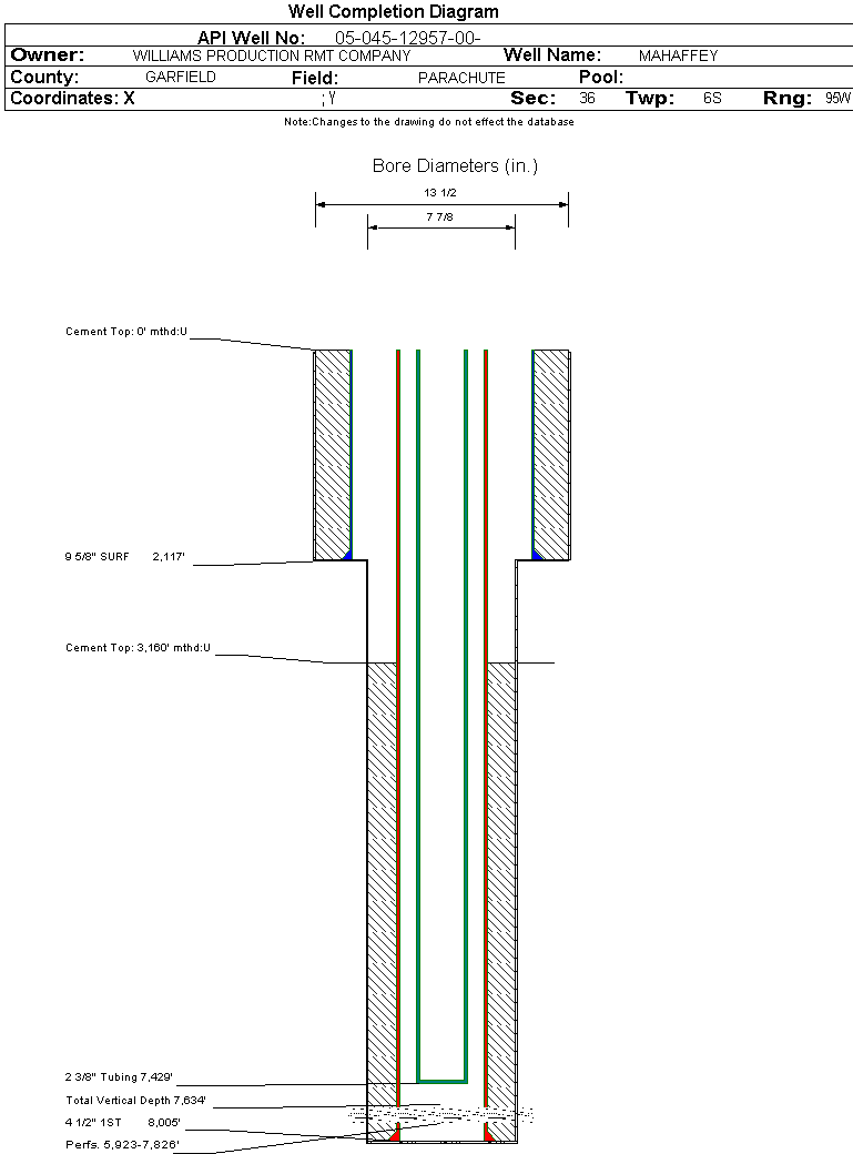 Wellbore #00 Wellbore Classification: GW Status: PR - 8/24/2006 Measured TD: 8017 ft. Vertical TD: 7634 ft.| Wellbore Data for Original Wellbore | Wellbore Classification: GW PR - 8/24/2006 | | Wellbore Permit | DIRECTIONAL | | Permit #: | 20064357 | Expiration Date: | 10/4/2007 | | Proposed Top PZ Location: | Sec: Twp: | Footage: 2597 FSL 682 FEL | | Bottom Hole Location: | Sec: Twp: | Footage: 2597 682 | | Proposed Depth/Form: | 8025 ft. | | Surface Mineral Owner Same: | No | | Mineral Owner: | FEE | Surface Owner: | FEE | | Unit: | | Unit Number: | | | Formation And Spacing: | Code: WMFK , Formation: WILLIAMS FORK , Order: 440-28 , Unit Acreage: 320, Drill Unit: S2 |