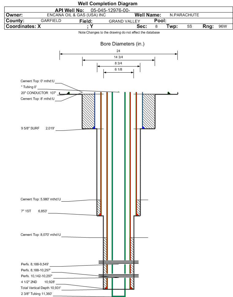 | Wellbore Completed | | Completion Date: | 6/21/2007 | | Spud Date: | 5/19/2007 | Spud Date Is: | ACTUAL | | Measured TD: | 10933 ft. | Measured PB depth: | 10770 ft. | | True Vertical TD: | 10931 ft. | True Vertical PB depth: | 10767 ft. | | Top PZ Location: | Sec:8 Twp: 5S 96W | Footage: 2237 FNL 2384 FEL | | Bottom Hole Location: | Sec:8 Twp: 5S 96W | Footage: 2237 FNL 2384 FEL | | Log Types: | CBL/CCL/TEMP; CBL/VDL/MI/GR/CCL/TEMP; ML/SGR; TEMP/GR/CCL; AIT/GR/SP;CV/CAL/GR | | Casing: | String Type: CONDUCTOR, Hole Size: 24 in., Size: 20 in., Top: 0 ft., Depth: 107 ft., Weight: , Citings Type: ACTUAL | | Cement: | Sacks: , Top: 0 ft., Bottom: 107 ft., Determination Method: | | Casing: | String Type: SURF, Hole Size: 14.75 in., Size: 9.625 in., Top: 0 ft., Depth: 2019 ft., Weight: , Citings Type: ACTUAL | | Cement: | Sacks: 1400, Top: 8 ft., Bottom: 2038 ft., Determination Method: | | Casing: | String Type: 1ST, Hole Size: 8.75 in., Size: 7 in., Top: 0 ft., Depth: 6853 ft., Weight: , Citings Type: ACTUAL | | Cement: | Sacks: 470, Top: 5980 ft., Bottom: 6853 ft., Determination Method: CBL | | Casing: | String Type: 2ND, Hole Size: 6.125 in., Size: 4.5 in., Top: 0 ft., Depth: 10928 ft., Weight: , Citings Type: ACTUAL | | Cement: | Sacks: 275, Top: 8070 ft., Bottom: 10928 ft., Determination Method: CBL | | Formation | Interval Top | Log Bottom | Cored | DSTs | | WASATCH | 2323 ft. | 4575 ft. | N | N | | OHIO CREEK | 5798 ft. | | N | N | | WILLIAMS FORK | 6245 ft. | | N | N | | CAMEO | 9032 ft. | | N | N | | ROLLINS | 9608 ft. | | N | N | | COZZETTE | 9830 ft. | | N | N | | SEGO | 10418 ft. | | N | N |